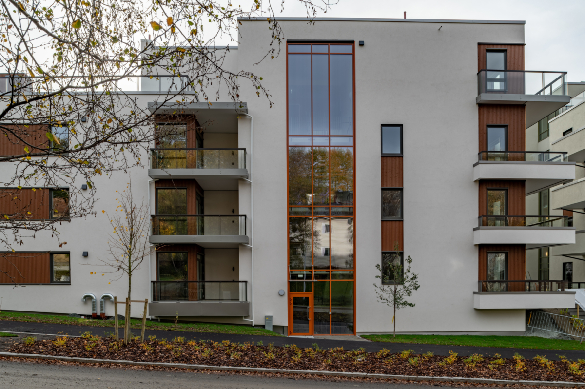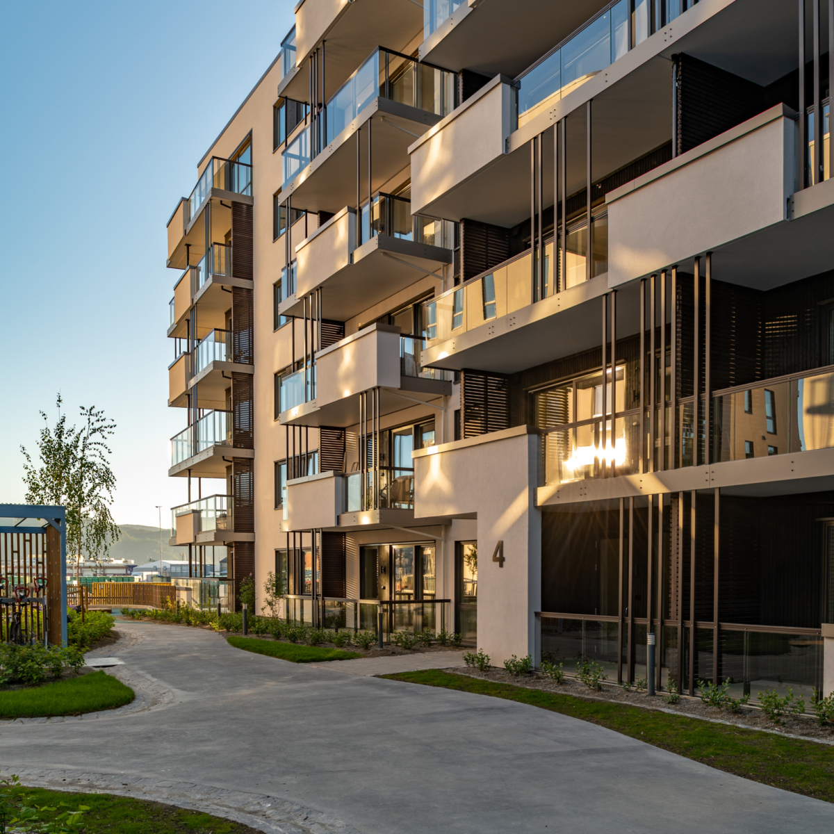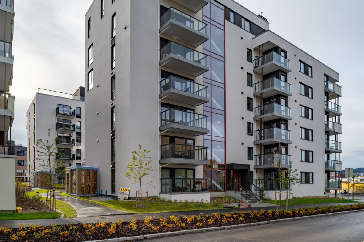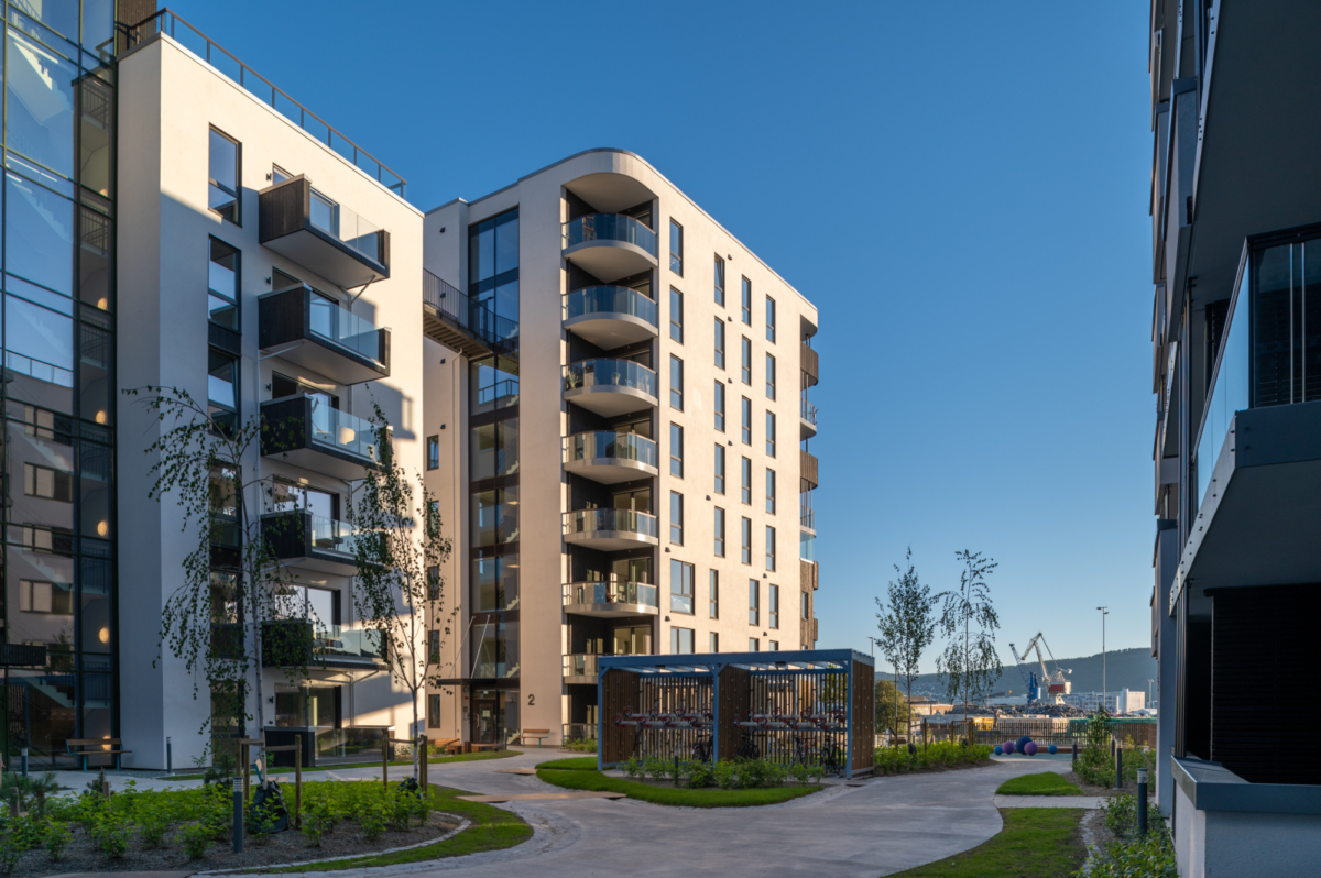 Tomta er relativt smal, og det ble lagt mye arbeid i å utvikle gode, solfylte uterom med Ladebekken som en velfungerende bygate med identitet.