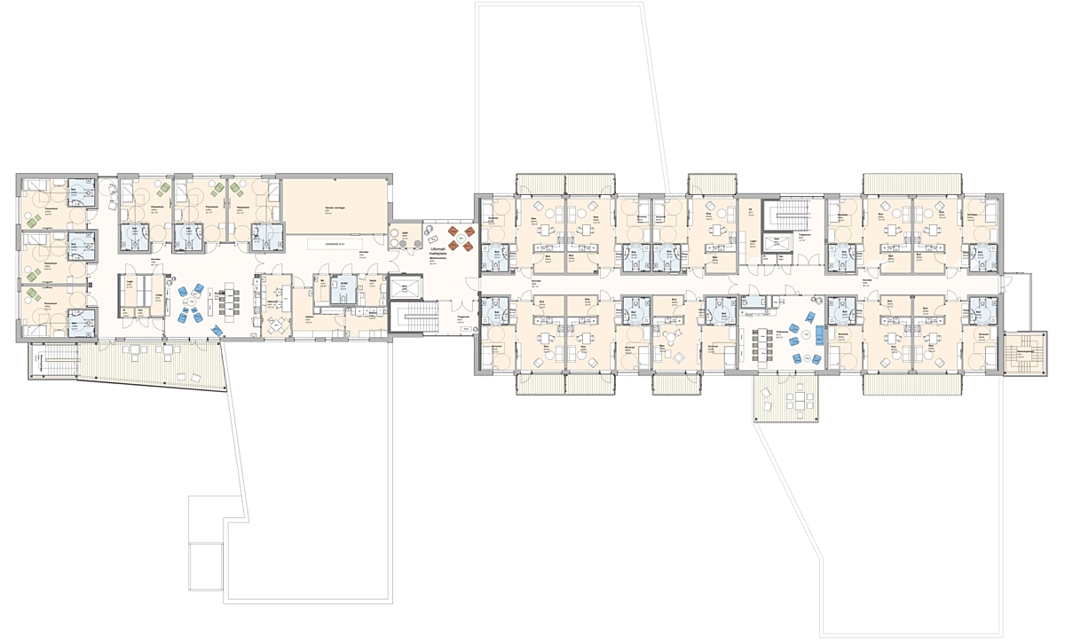 Material- og fargepaletten er inspirert av naturen og bidrar til å skape en trygg og trivelig atmosfære. Hovedgrepene for interiørkonseptet er strøket med sine utadvendte virksomheter, sammenheng ute/ inne og ekstra materialkvalitet i prioriterte områder. I interiørkonseptet er sola, sjøen og skogen inspirasjon for å skape sammenheng mellom ute og inne. Dette kommer frem i fargevalg og mønster på tapet og tekstiler.