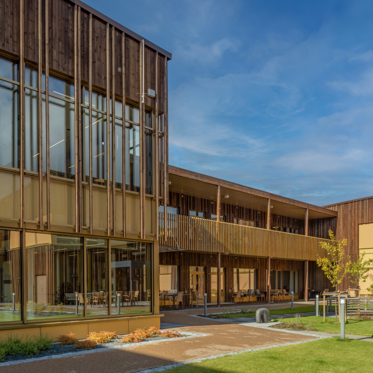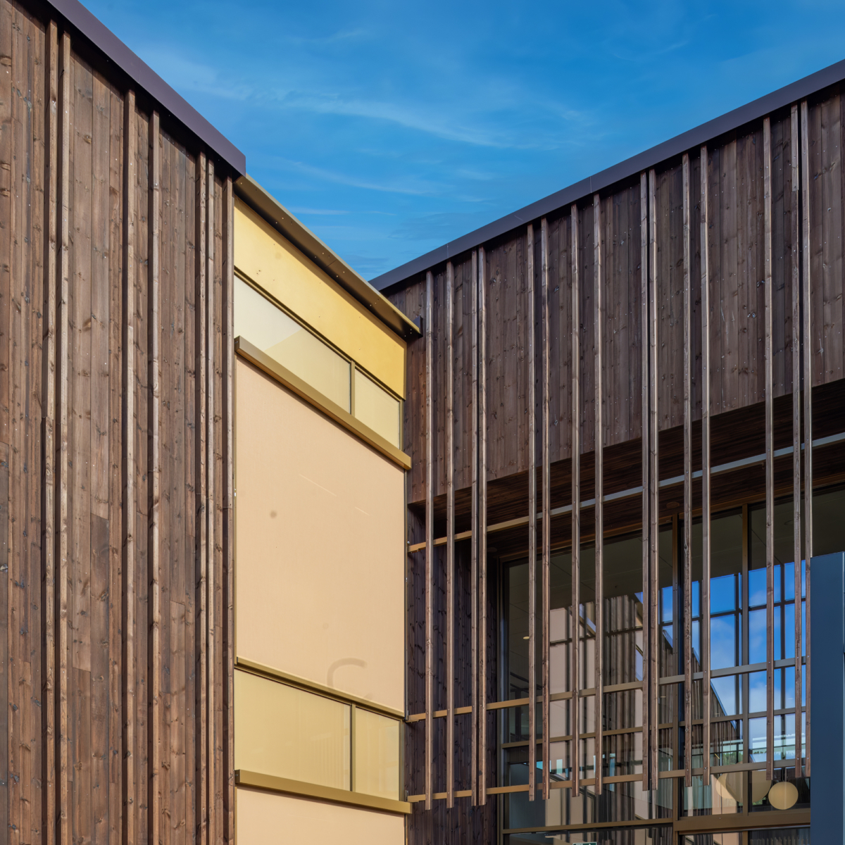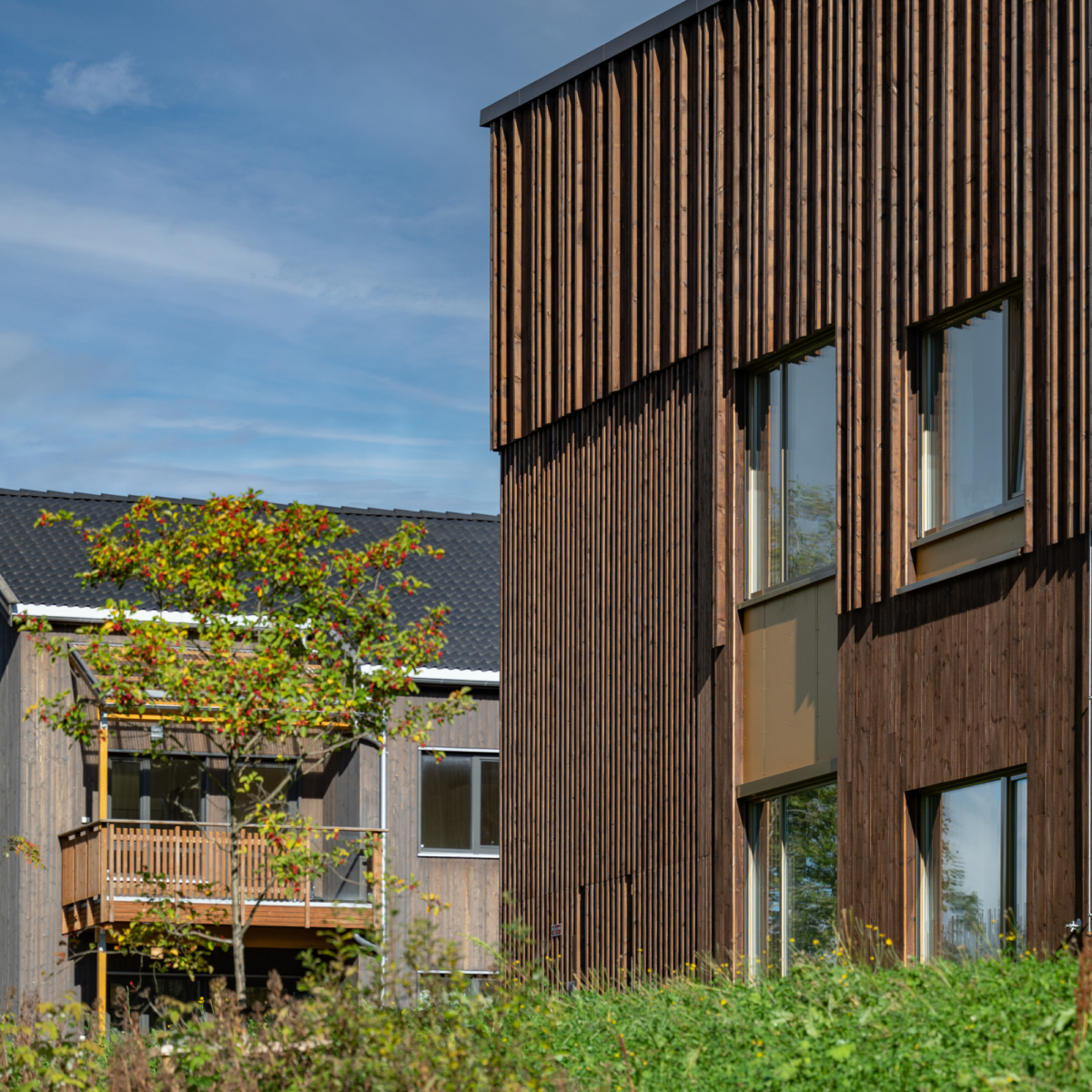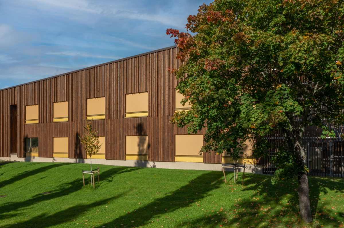 Gesimskanter på alle hovedtak er skrå, noe som gir variasjon på fasadene. Kledning er en moderne tolkning av bebyggelse i nærheten, med en trekledning med utenpåliggende brune spiler i og vinduer i en gyllen farge. Innvendig brukes det trekledning i korridorene og i vestibyle/storstue. På vegger og gulv velges det lyse og varme farger som er koordinert med møbleringskonseptet for bygget.