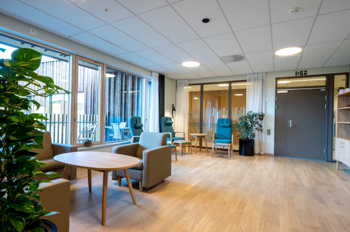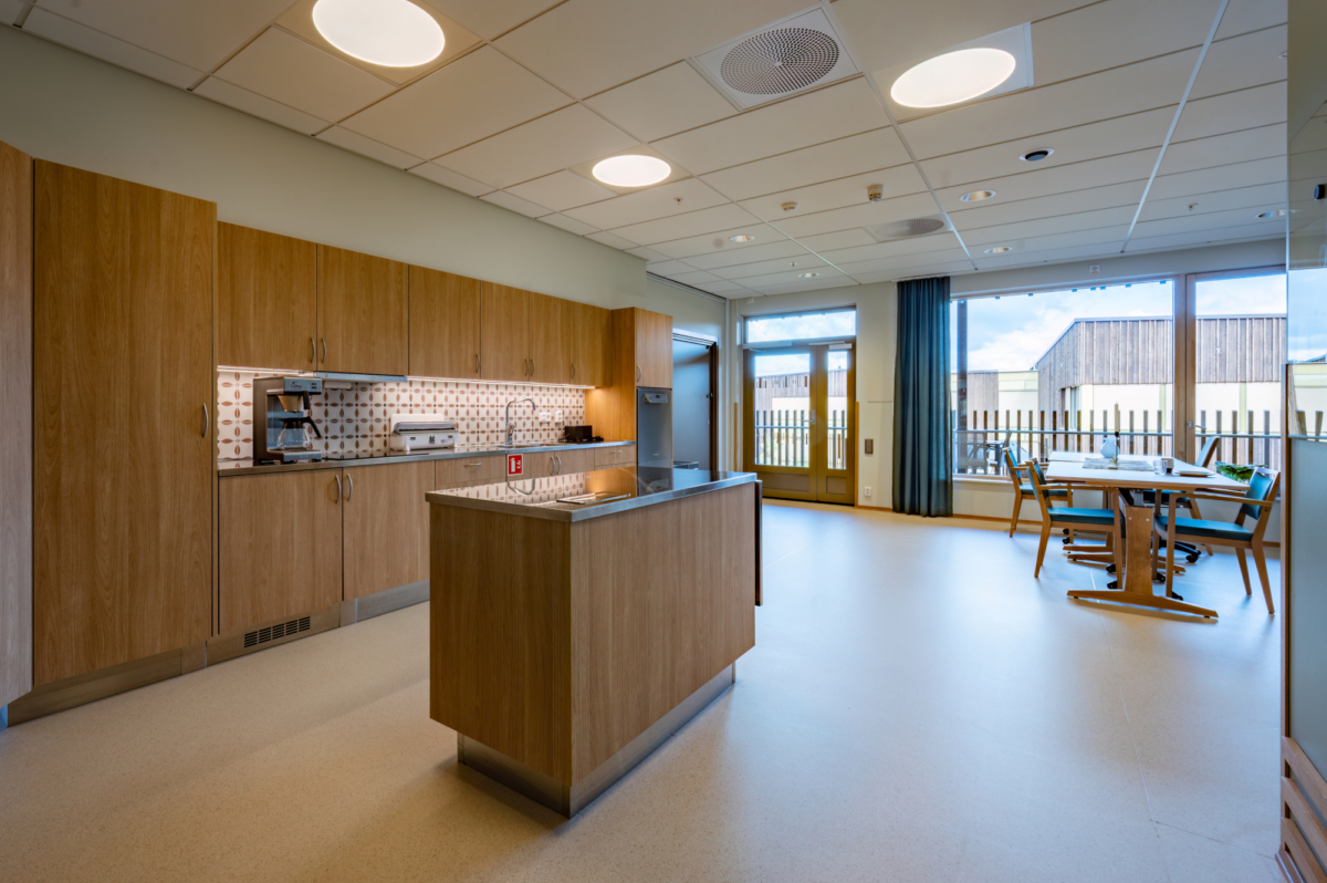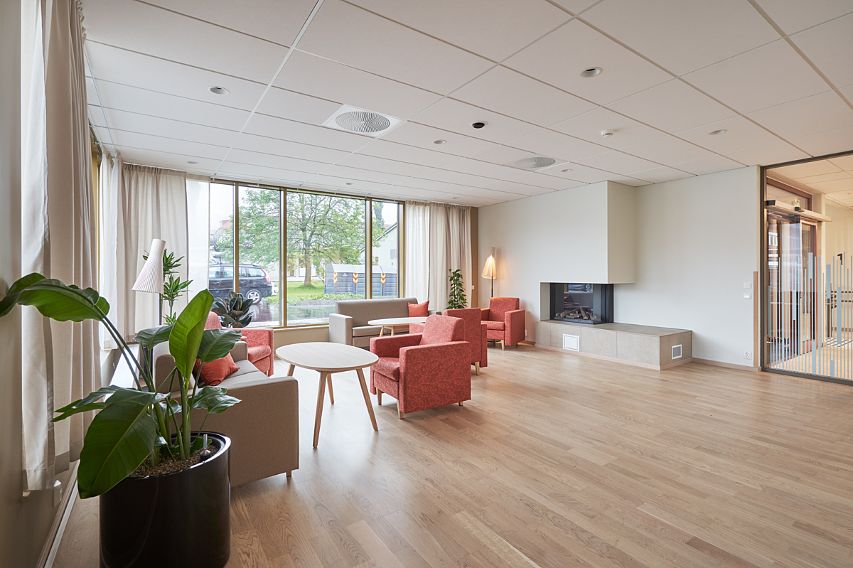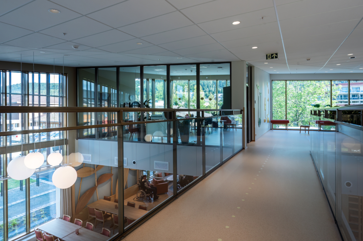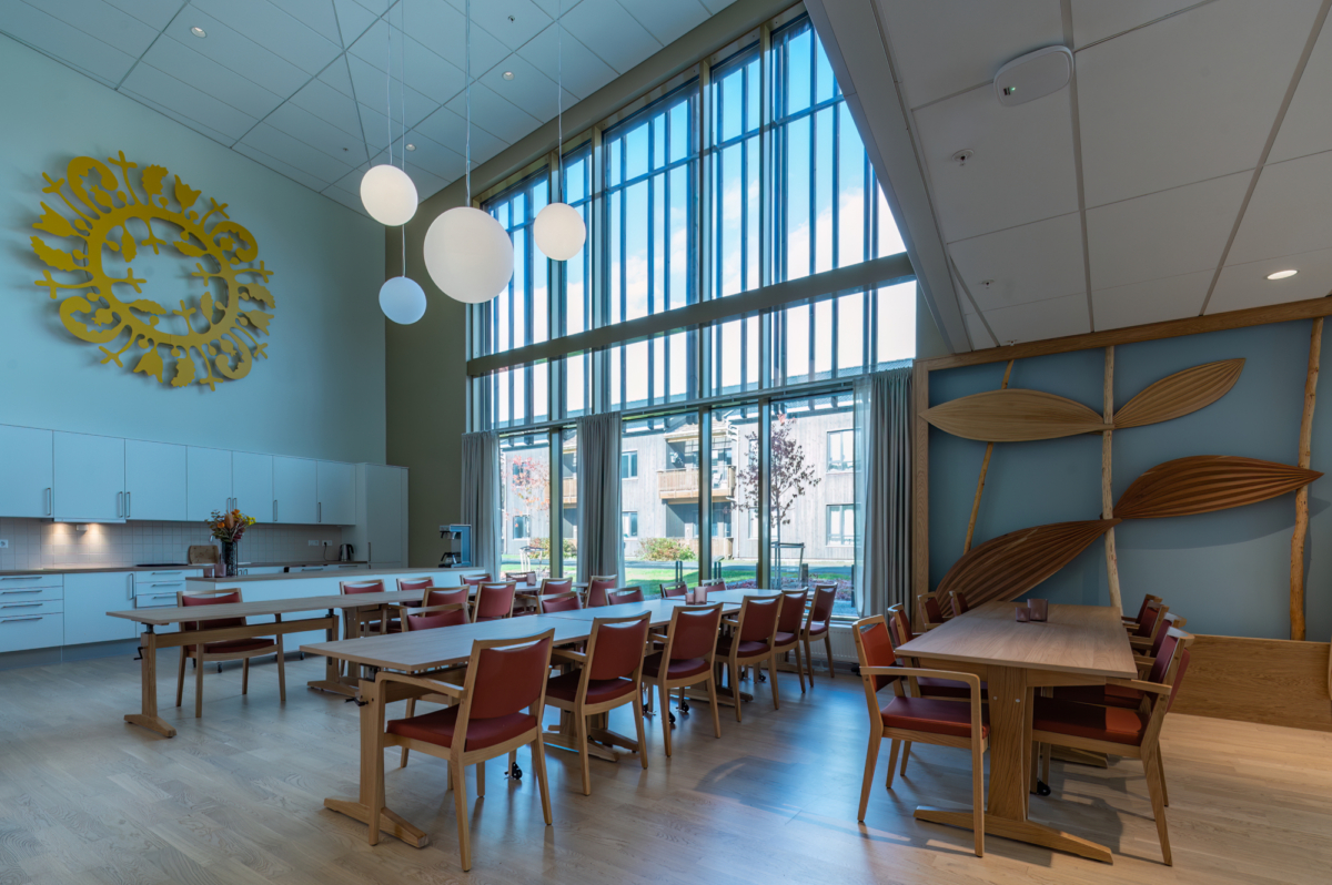 I sykehjemsavdelingen er det brukt rolige, naturlige kontraster av blått og grønt, mens i mer aktive deler av bygget som storstue og aktivitetsrom er det brukt varme farger av okergult og terracotta. Gjenkjennbarhet i gjenstander er viktig for personer med demens da dette skaper en trygghetsfølelse, og det er derfor medtatt gjenbruksmøbler i prosjektet.
