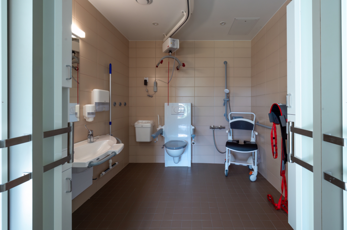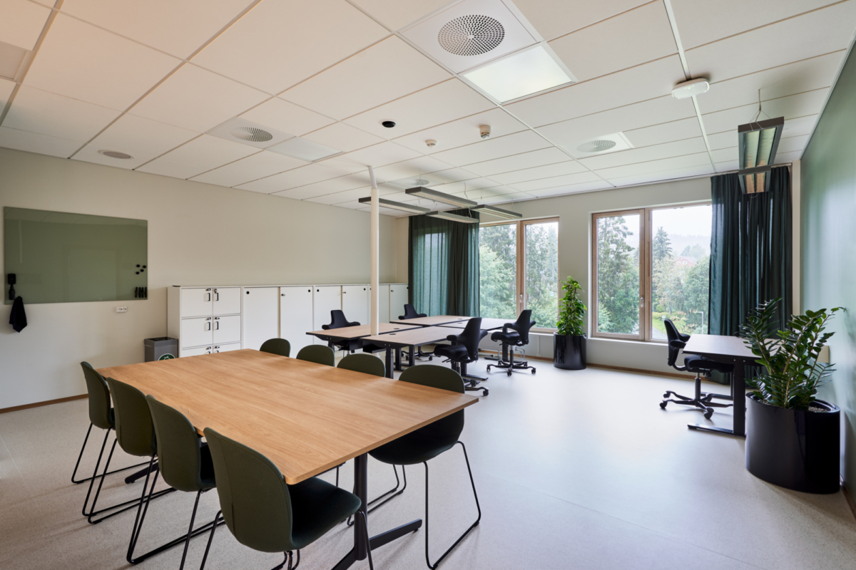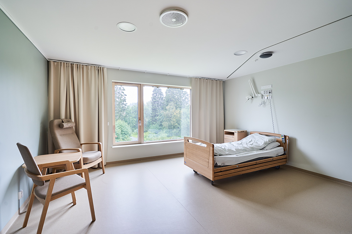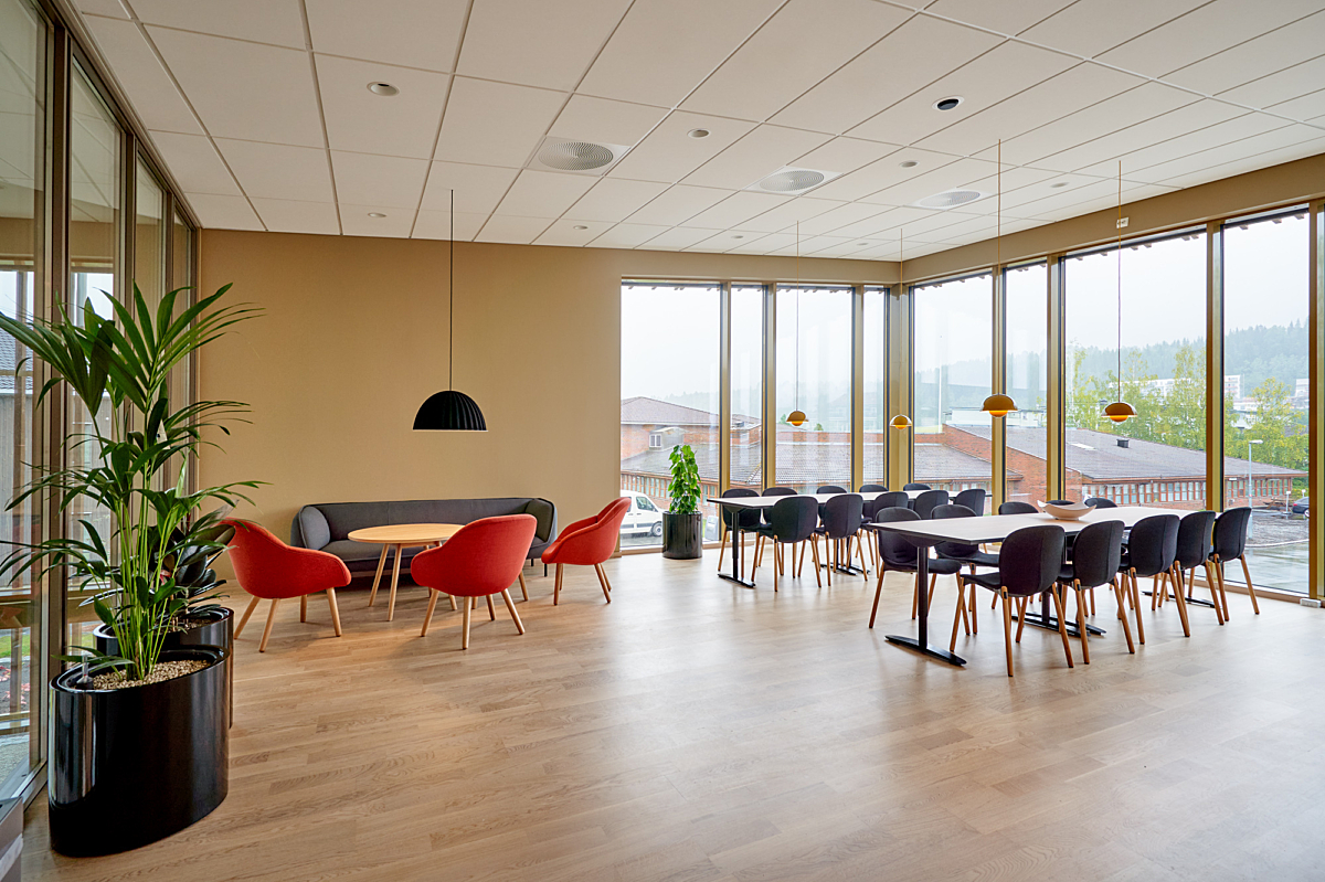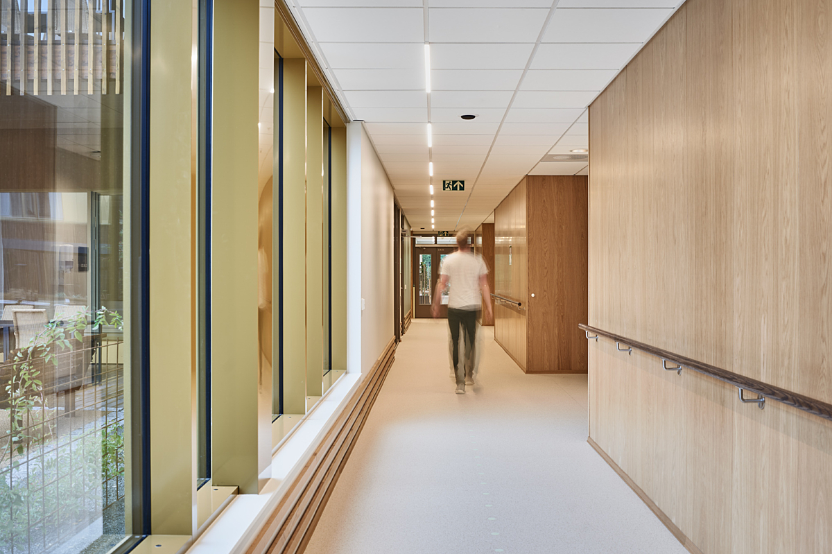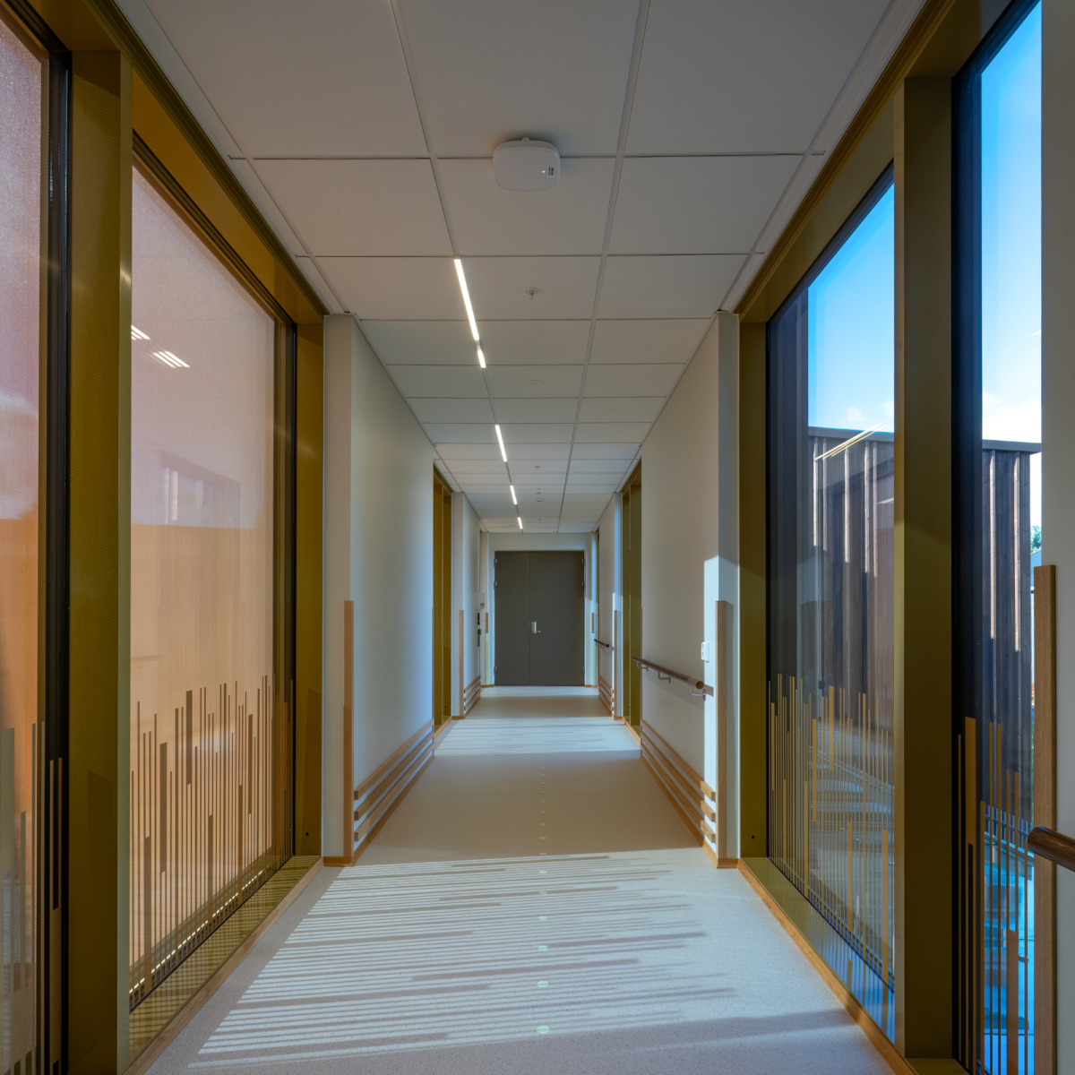 I sykehjemsavdelingen er det brukt rolige, naturlige kontraster av blått og grønt, mens i mer aktive deler av bygget som storstue og aktivitetsrom er det brukt varme farger av okergult og terracotta. Gjenkjennbarhet i gjenstander er viktig for personer med demens da dette skaper en trygghetsfølelse, og det er derfor medtatt gjenbruksmøbler i prosjektet.