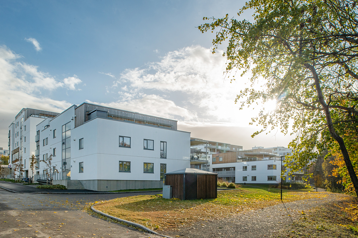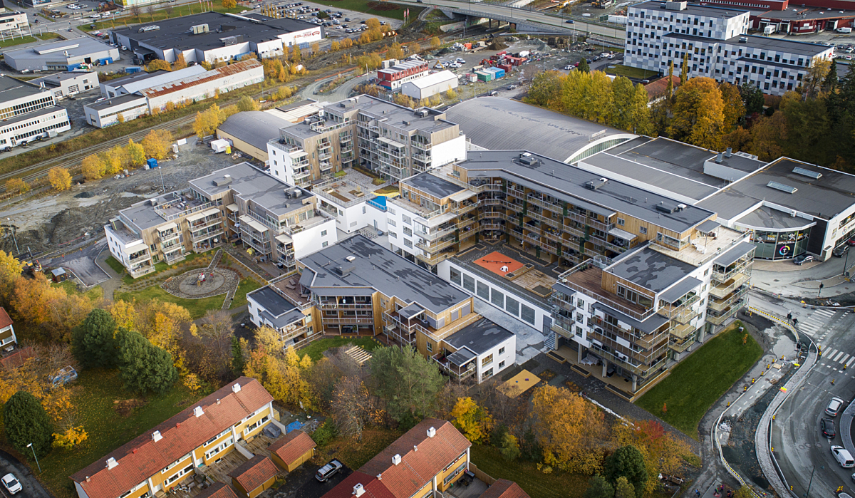 280 leiligheter fordelt i 6 boligblokker fra 2 til 6 etasjer med forretningslokaler og offentlig park.