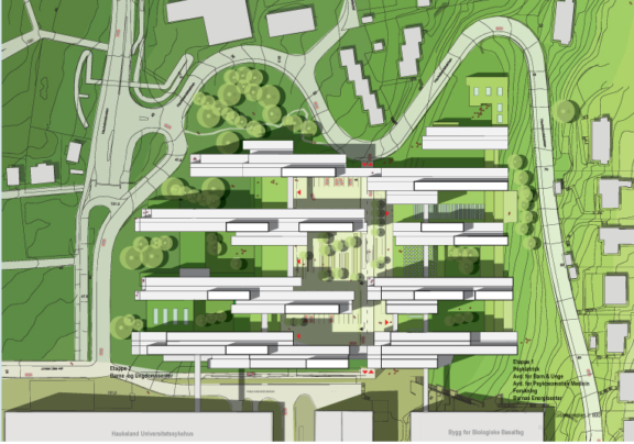Midt i anlegget ligger det en sentral adkomstplass hvor pasienter, ansatte og besøkende lett kan orientere seg. Sengeposter er lagt høyere opp i anlegget for lys, luft og utsikt. Tyngre funksjoner er lagt i «basen» som ligger på tvers og binder sammen anlegget. Prosjektet utføres i samarbeid med KHR Architecture, København, og Henning Larsen Architects, Trondheim, COWI, og Schønherr, København. Vinner av Bergen kommunes Arkitektur- og byformingspris (2017).