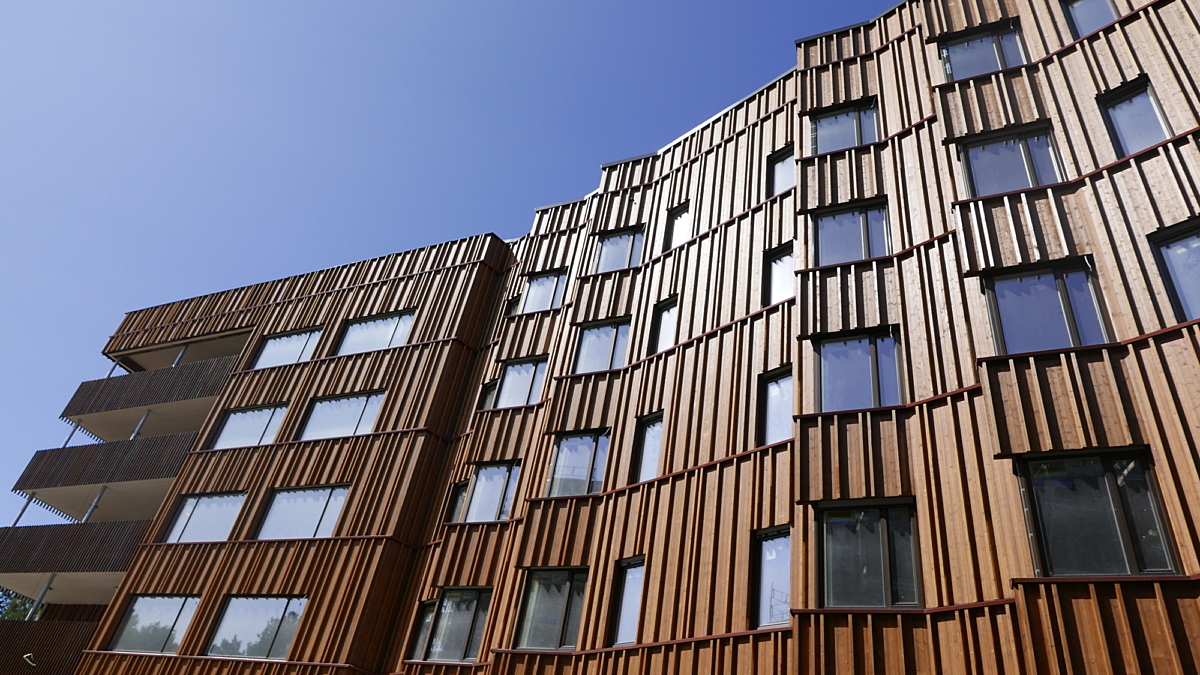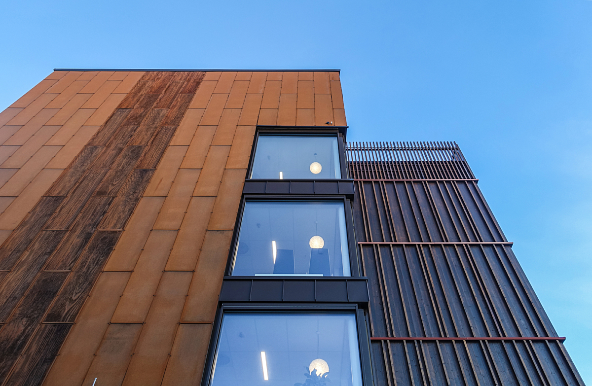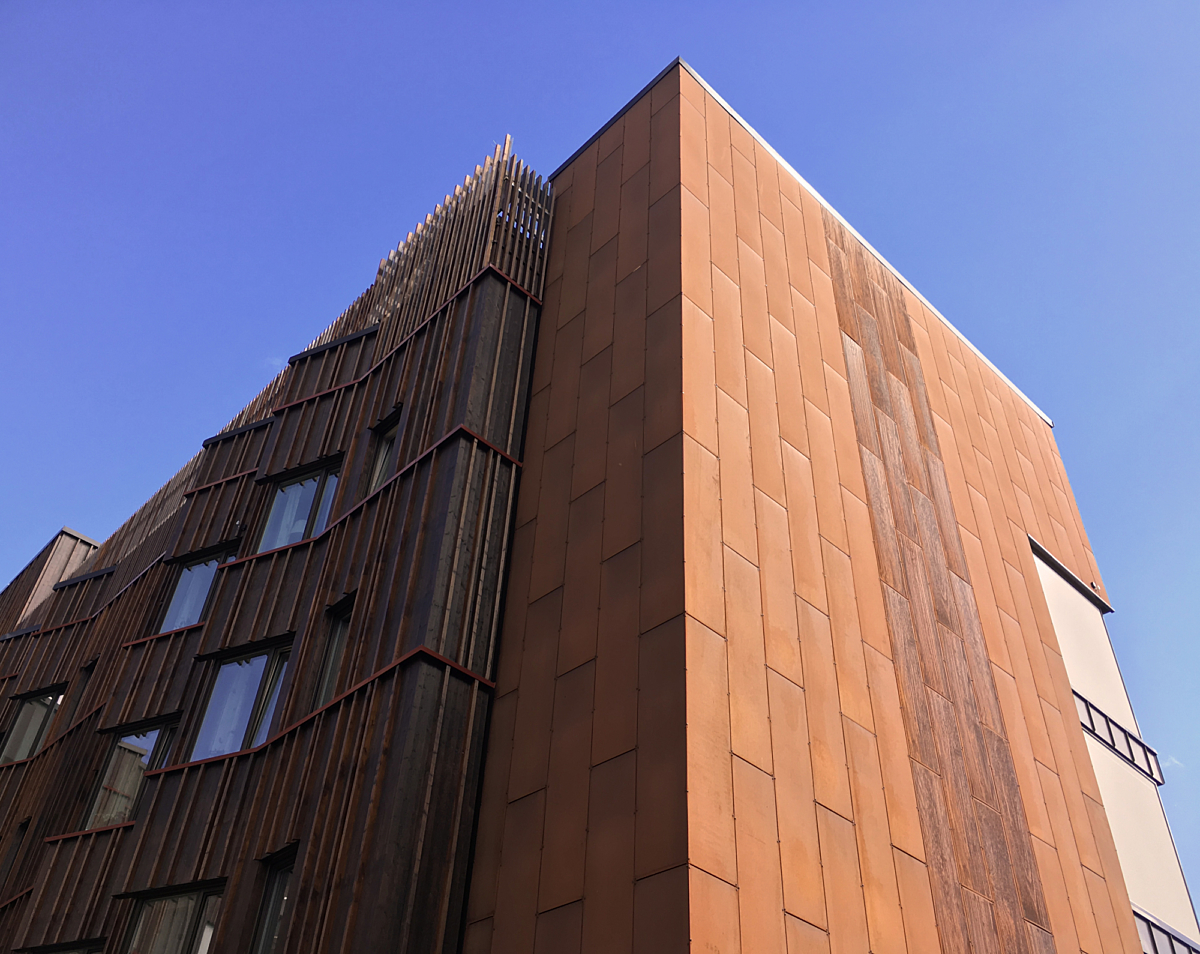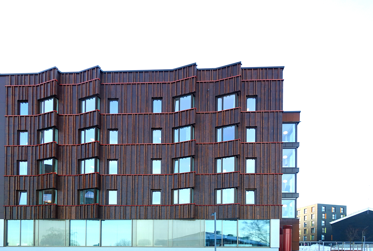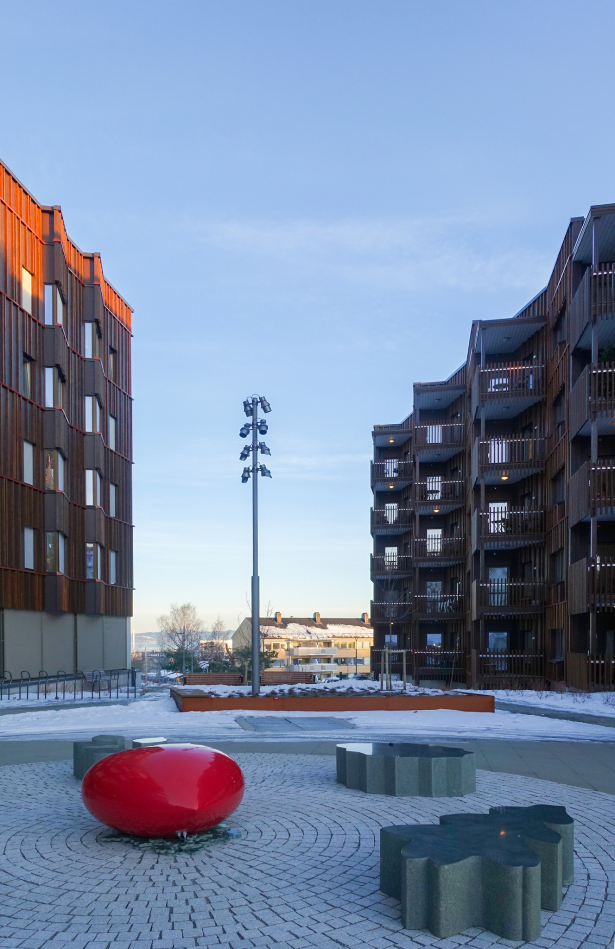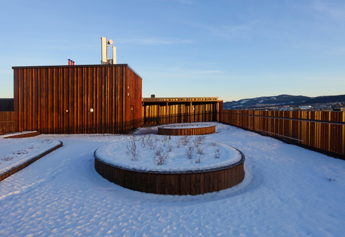 Parkering, varelevering og renovasjon er lagt på nedre nivå i øst, slik at resten av anlegget skjermes for den tyngste trafikken. På hovedbyggets tak er det etablert en solrik takterrasse med storslagen utsikt, noe som raskt har blitt populær.