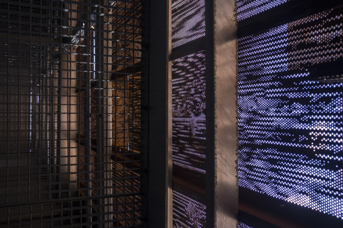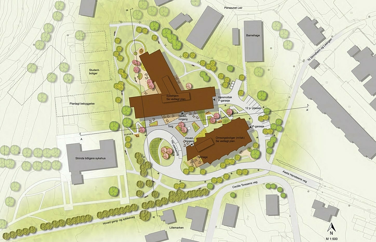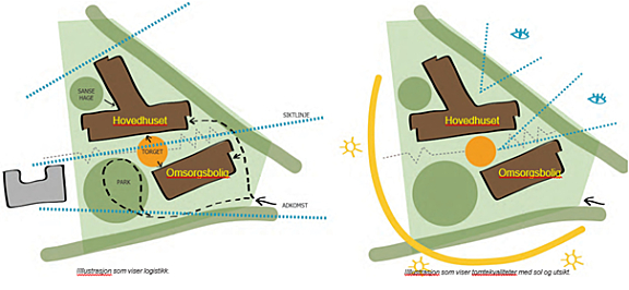 Mellom de ulike terrengnivåene gjør de mange snarveiene det enkelt å ta seg frem. En lukket sansehage ligger mot vest, godt skjermet av bygget og terrenget rundt. Her står sanseopplevelser som vekker minner gjennom lukt, smak og taktil følelse i fokus.