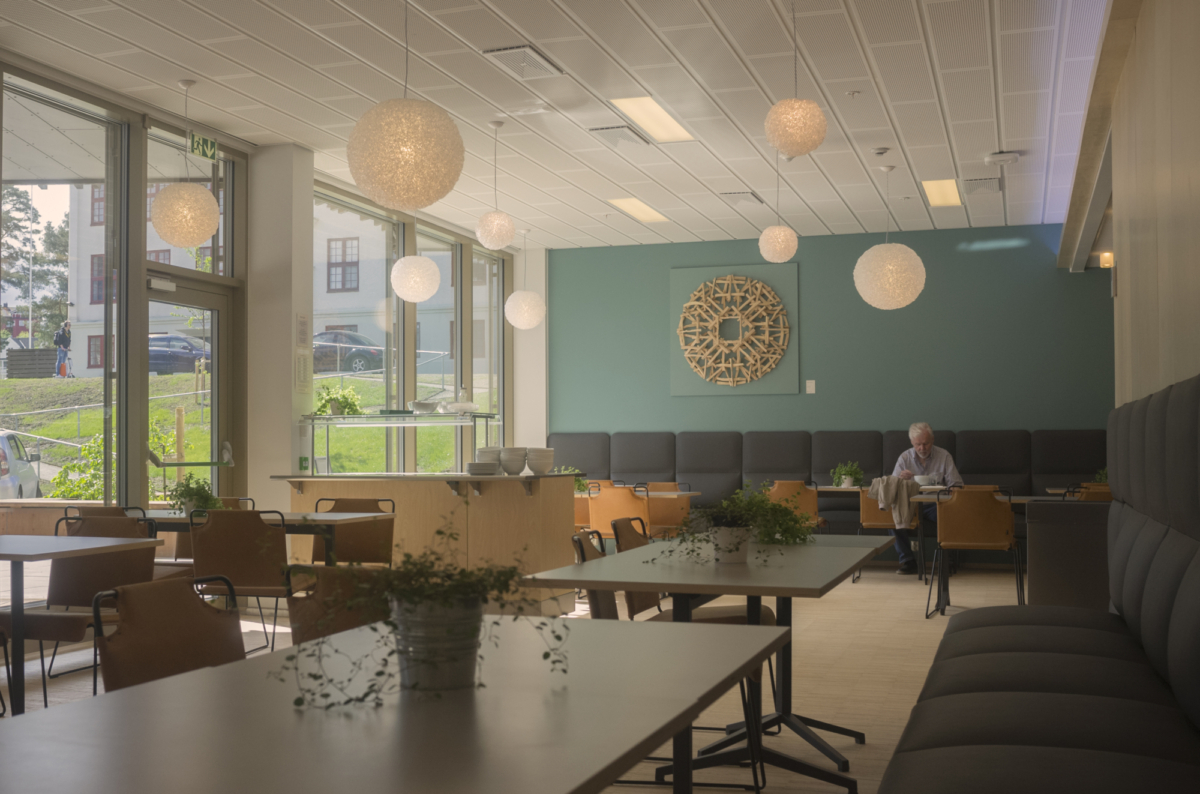 Den innerste delen av bydelskaféen kan ved behov skjermes med innredningselementer for å tilrettelegge for en rolig bespising uten for mye forstyrrelser.
