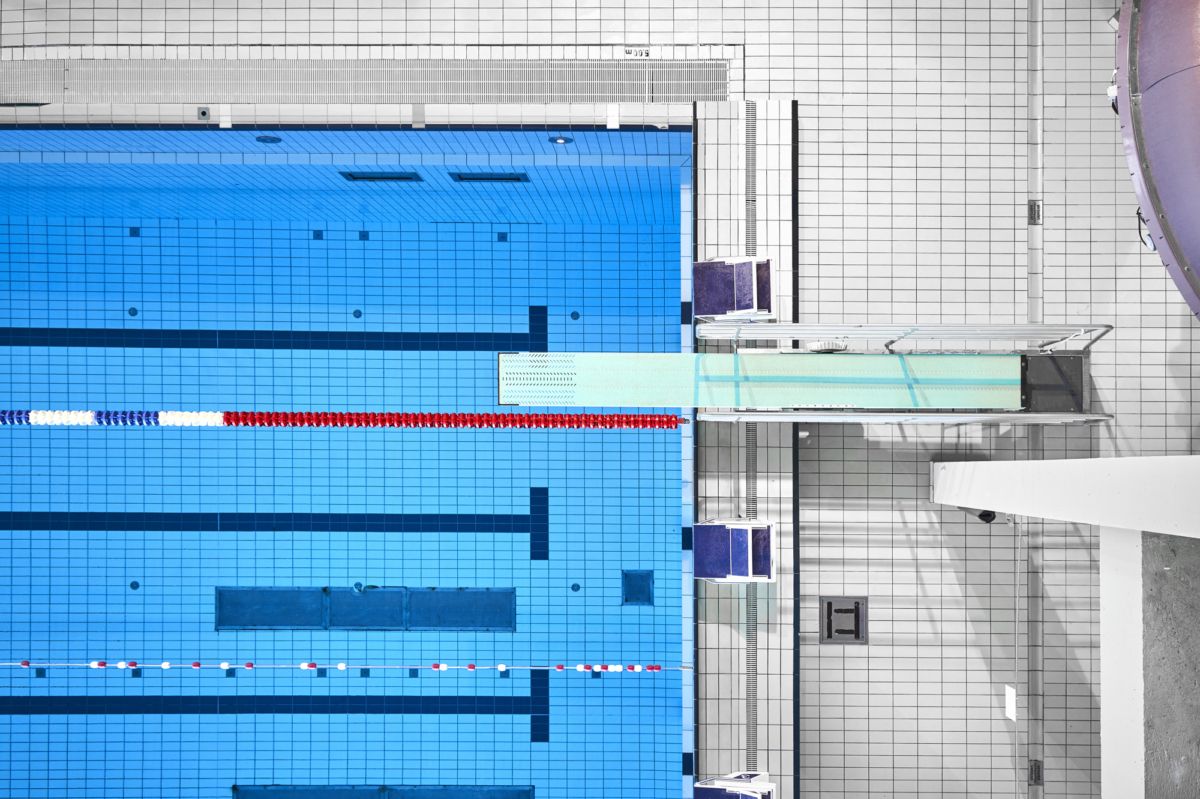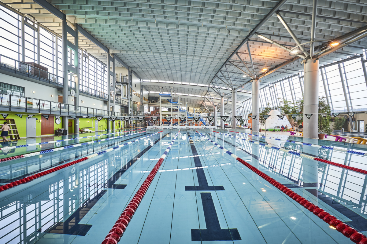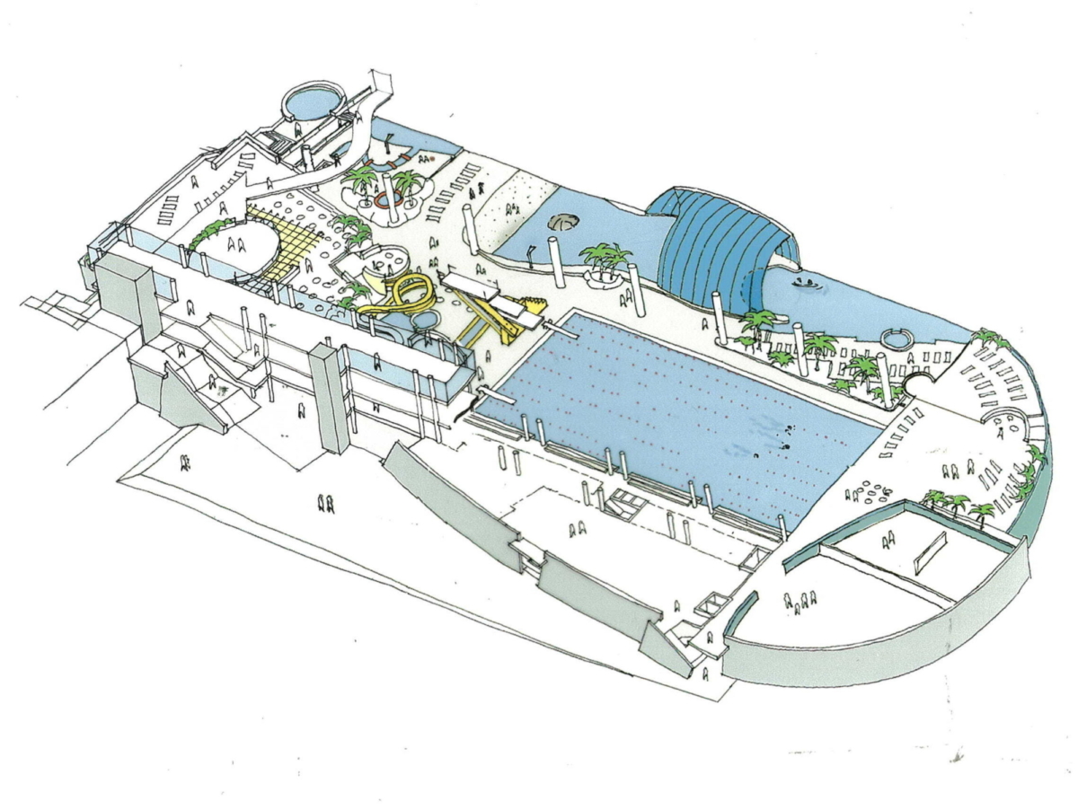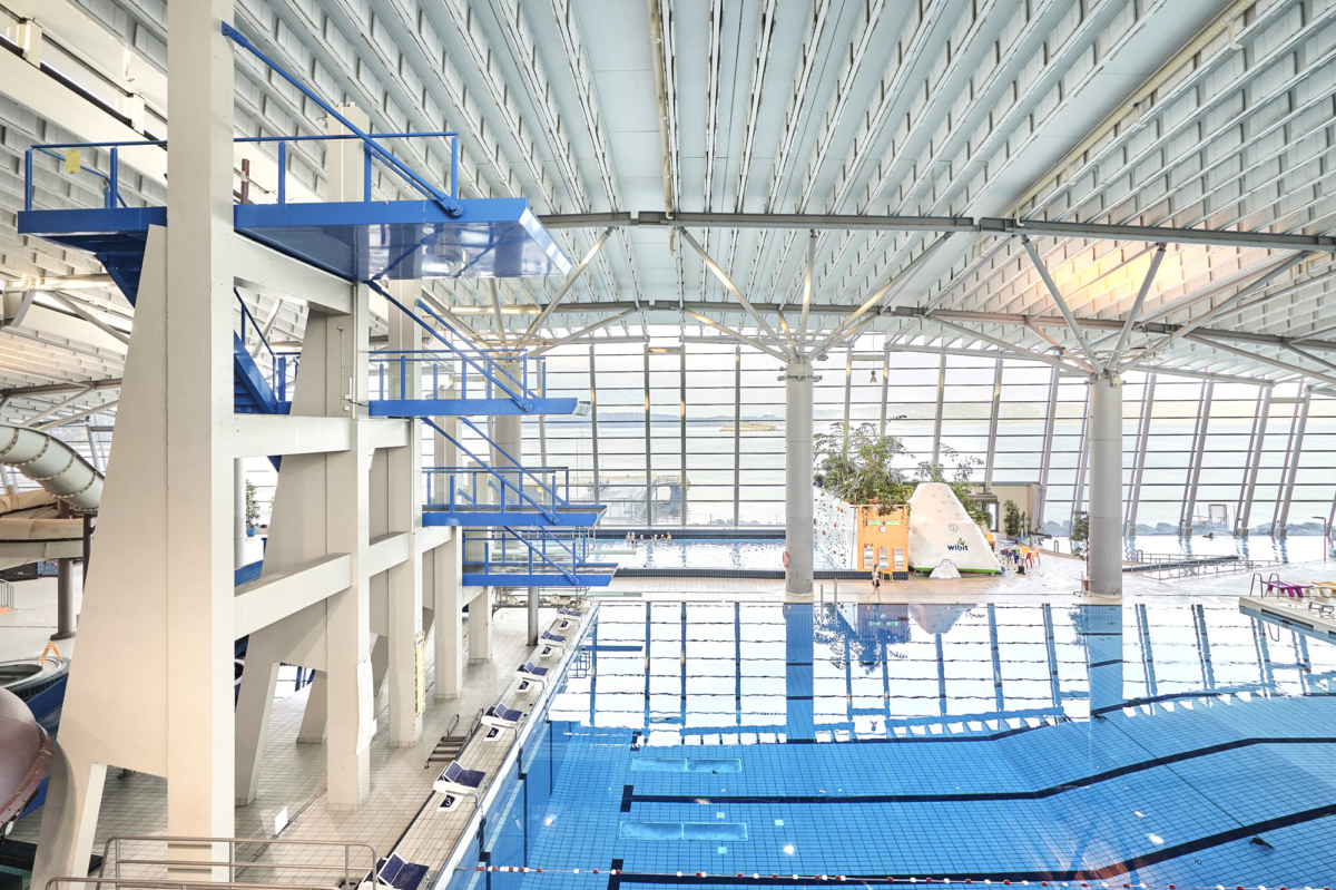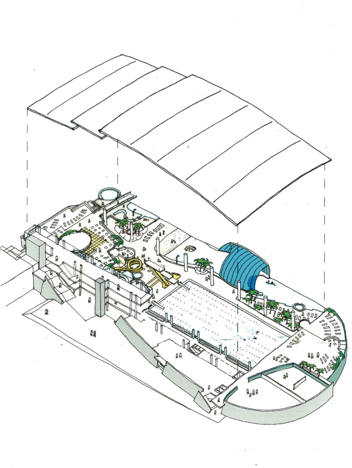 Svømme- og baderommet er et stort åpent areal, overdekket av et buet og fasettert tak og inndelt i soner for forskjellig aktivitet.