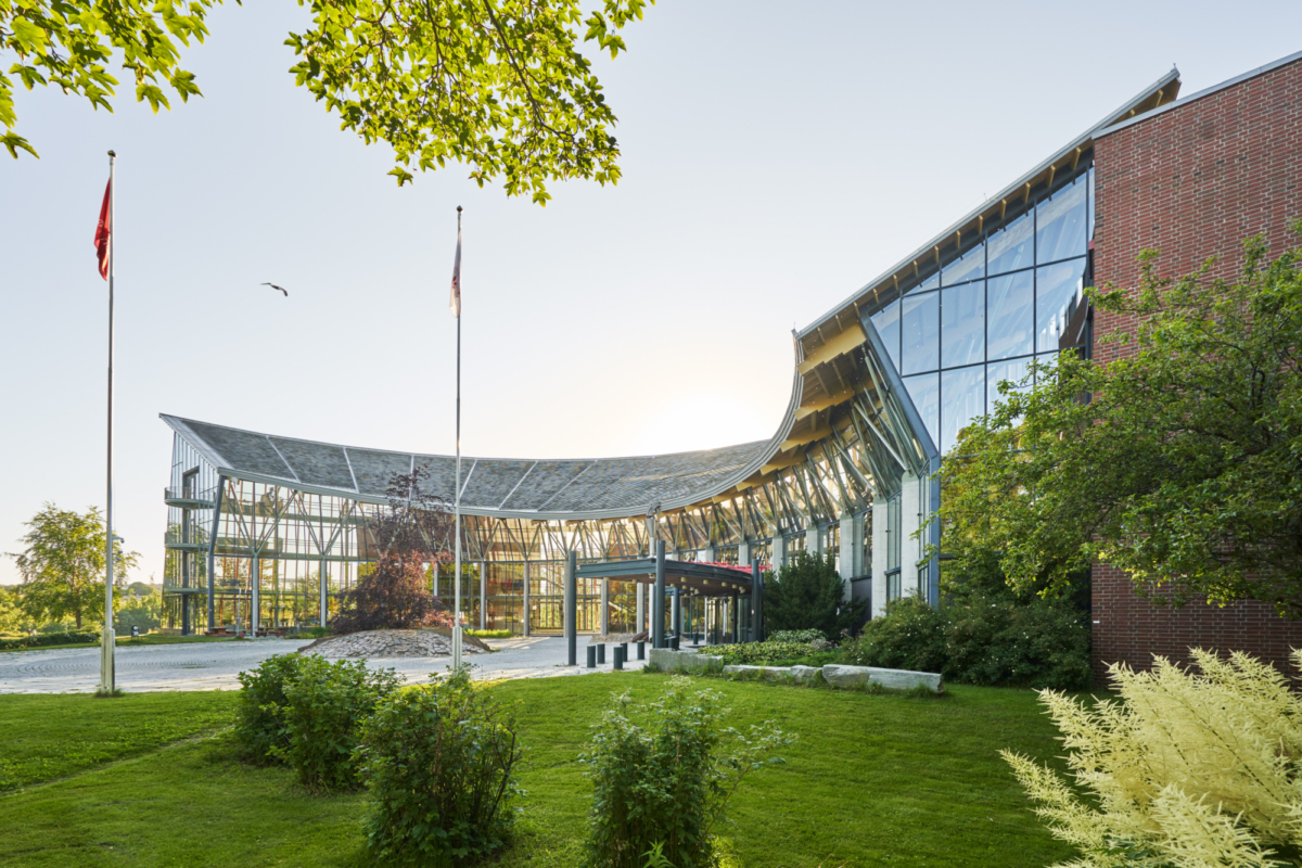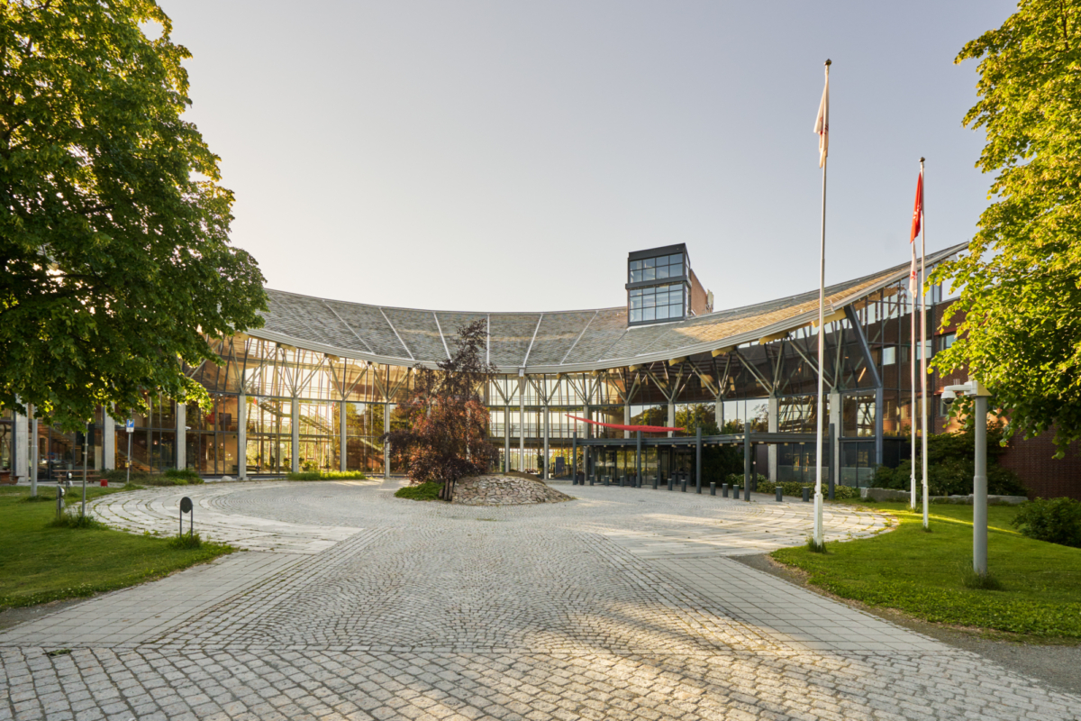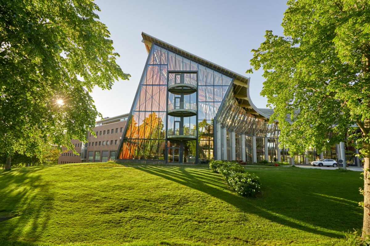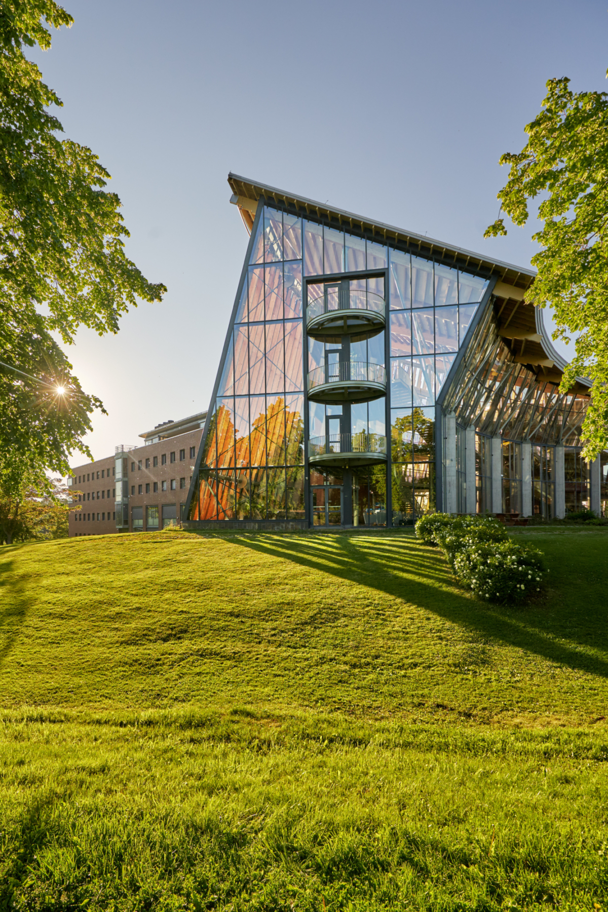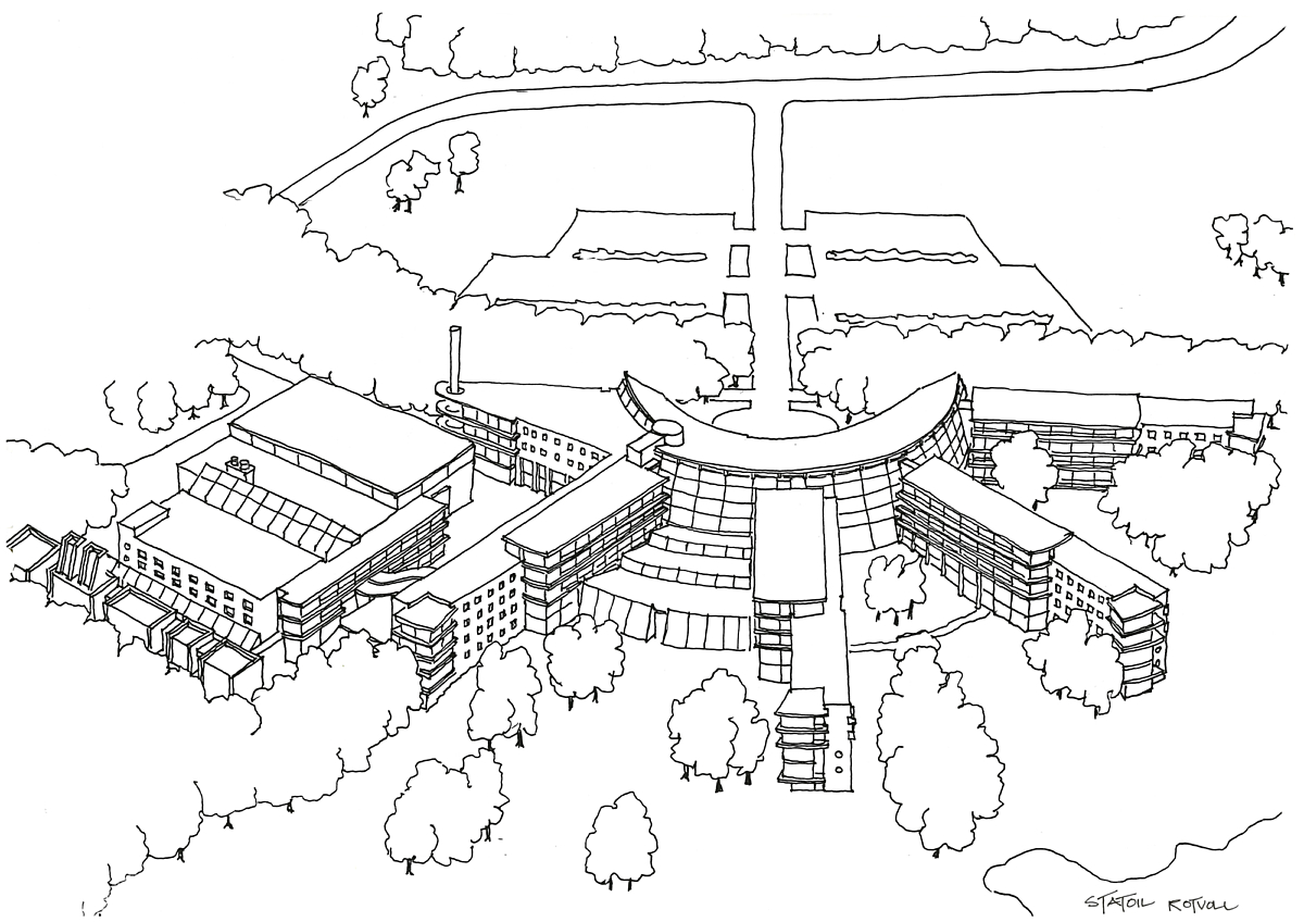 Forskningsanlegg i kulturlandskapet på Rotvoll i overgangssonen mellom land og fjord. Anlegget preges av enkle bygningsvolumer i vifteform ut fra en sentral/buet vestibyle og kantine som åpner seg mot fjorden.