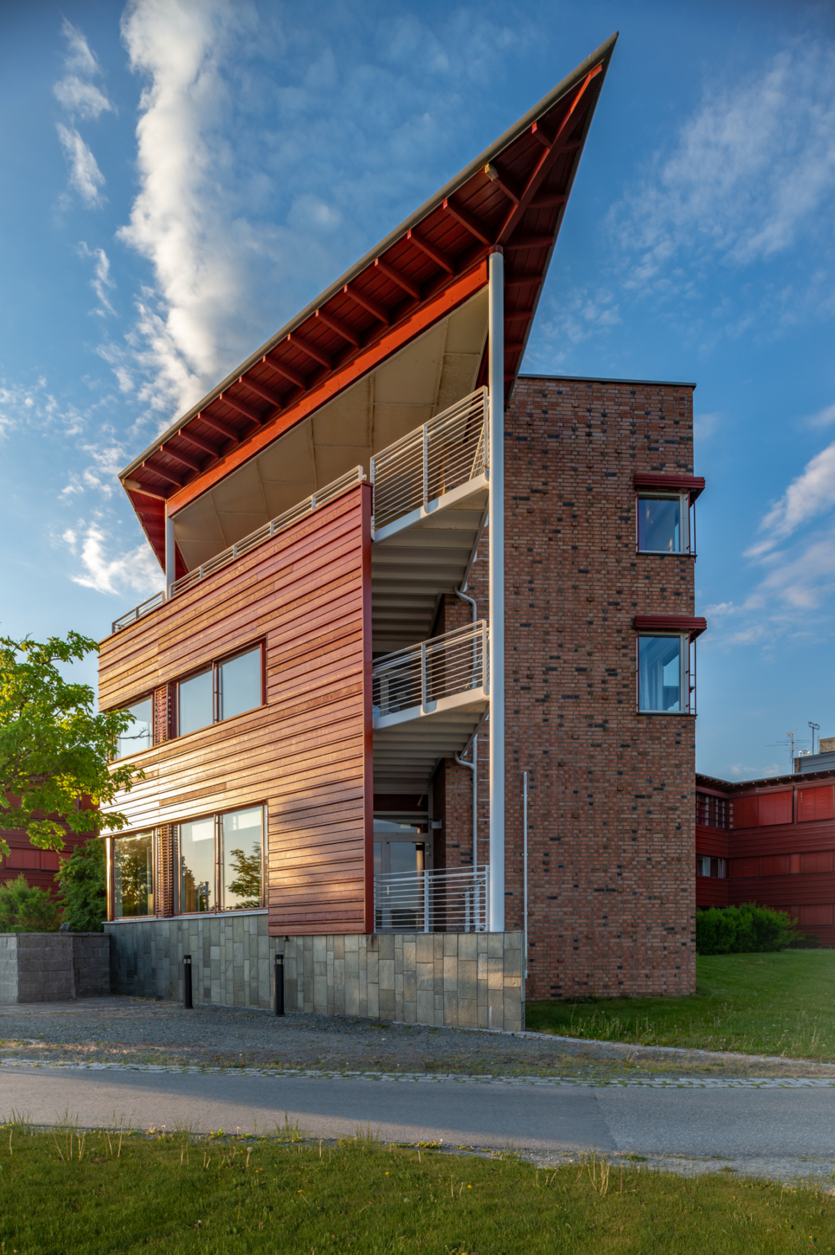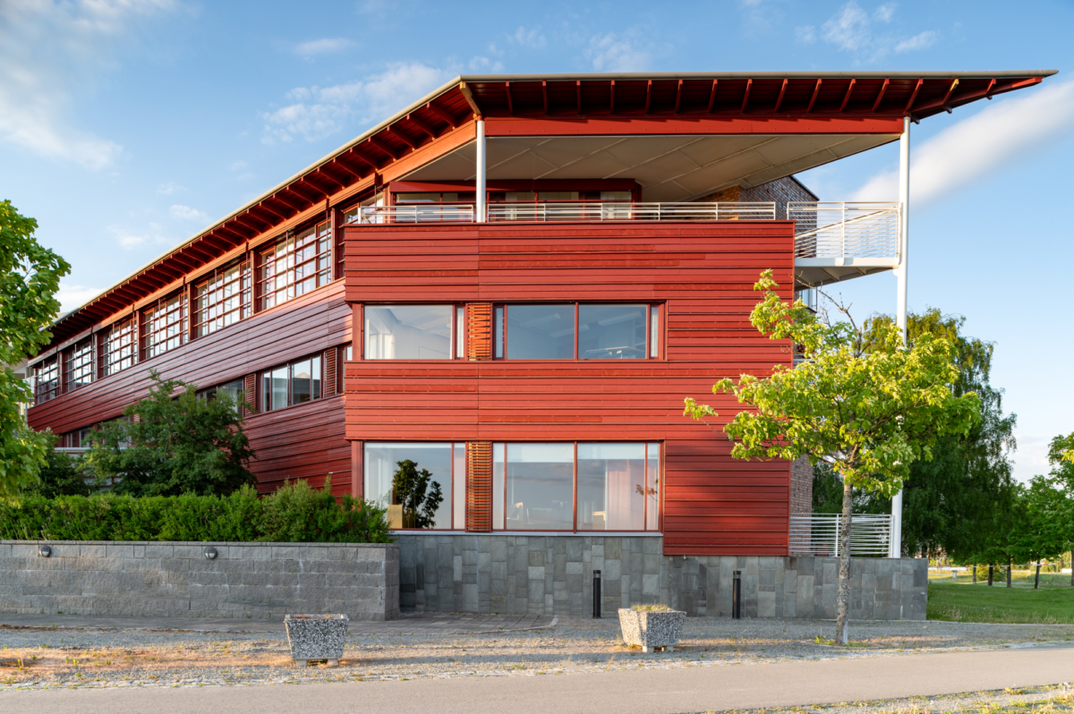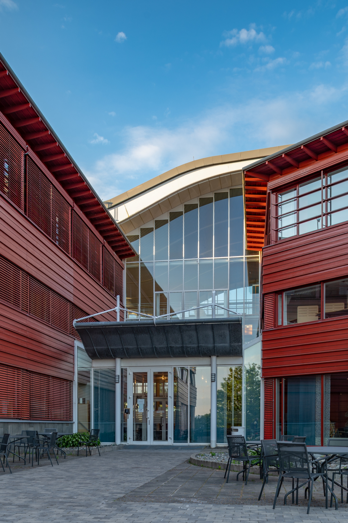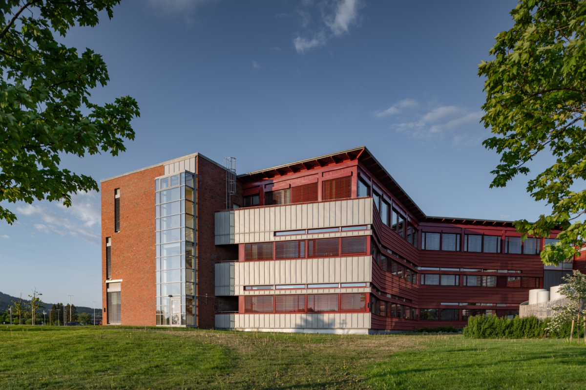 Bygget ligger sentralt på Tangen i Stjørdal, i en utfylling ved fjorden og forankret i en nyanlagt furubevokst høgde mot E6. Regional tilknytning med bruk av trepanel og tegl i fasadene. 4 fløyer med et sentralt glassoverdekket mellomrom med hovedinngang, kantine og fjordutsikt.