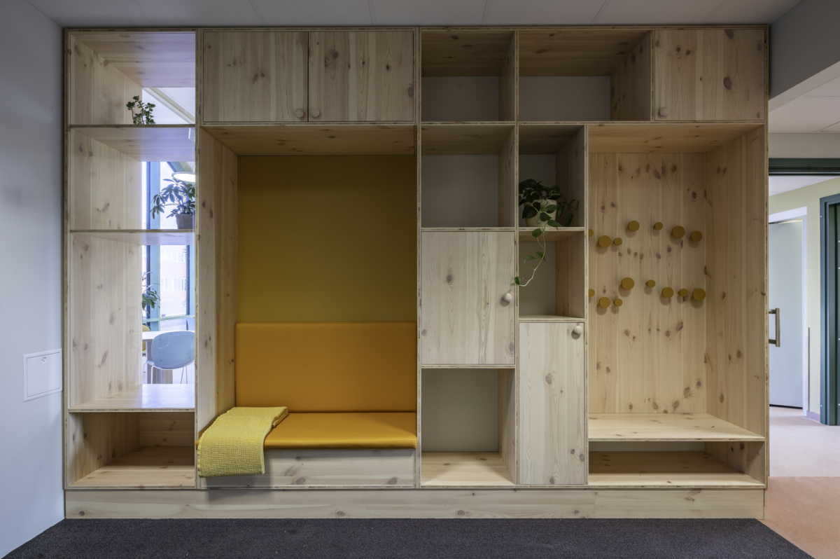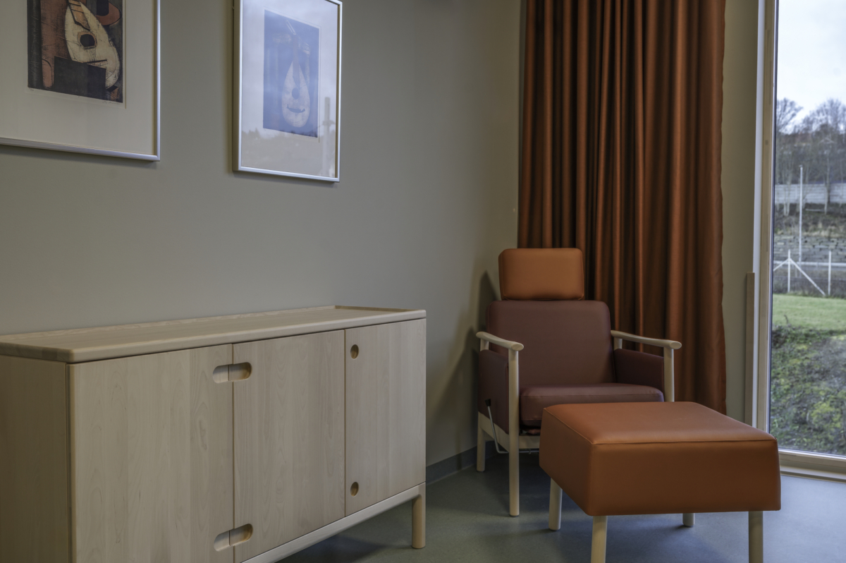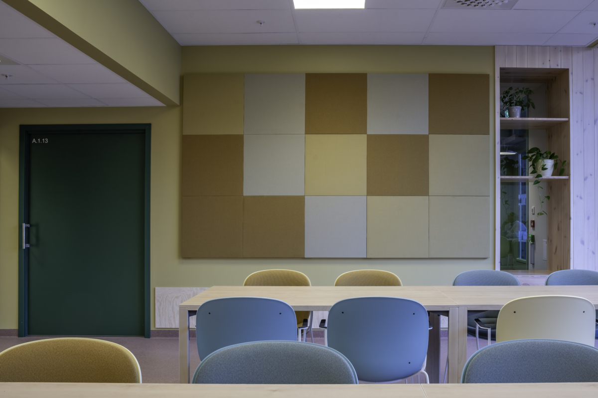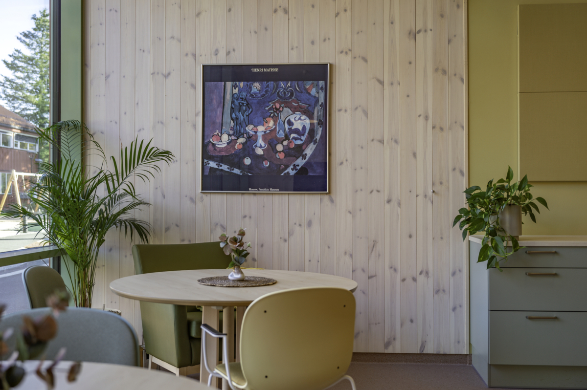 Generelt inne er det lagt vekt på å minimere korridorpreget, skape en variasjon av private og samlende oppholdsrom og det har hele veien vært stor fokus på universell utforming. Fargene og materialiteten inne i bygget er inspirert av området rundt med behagelige jordfarger og stor bruk av tre.