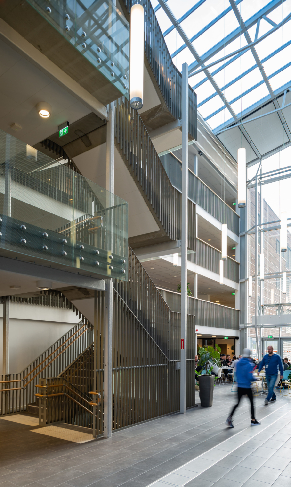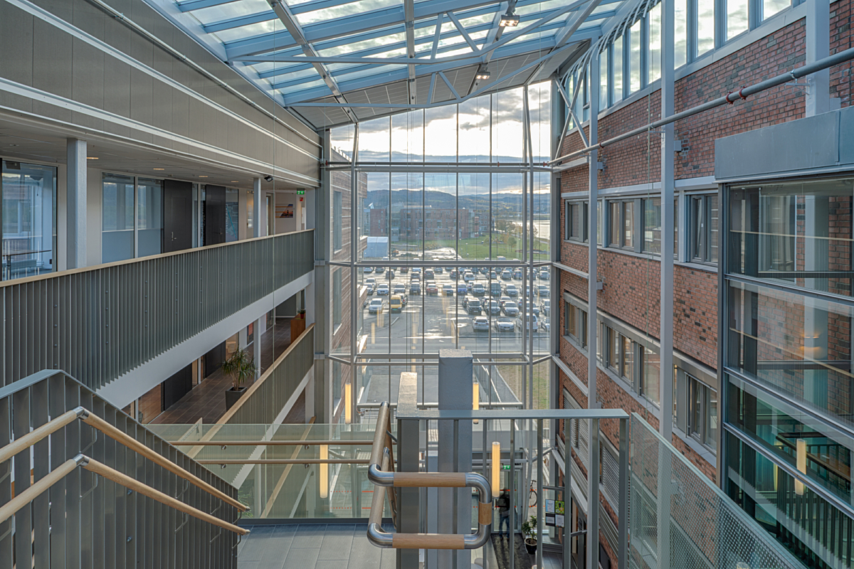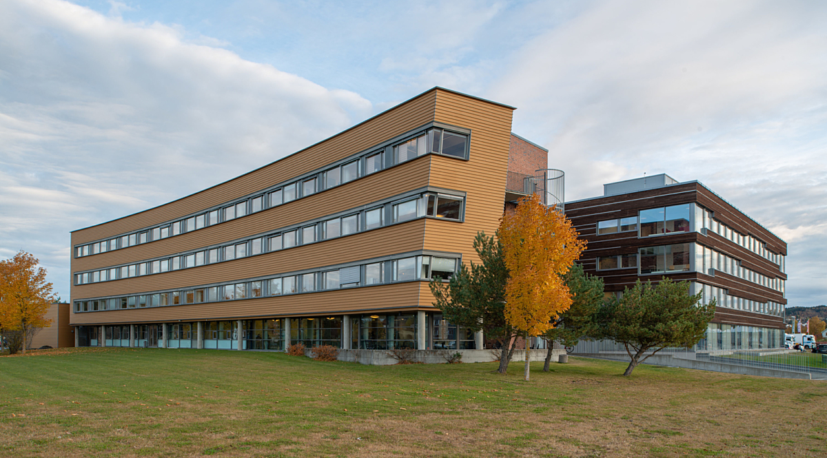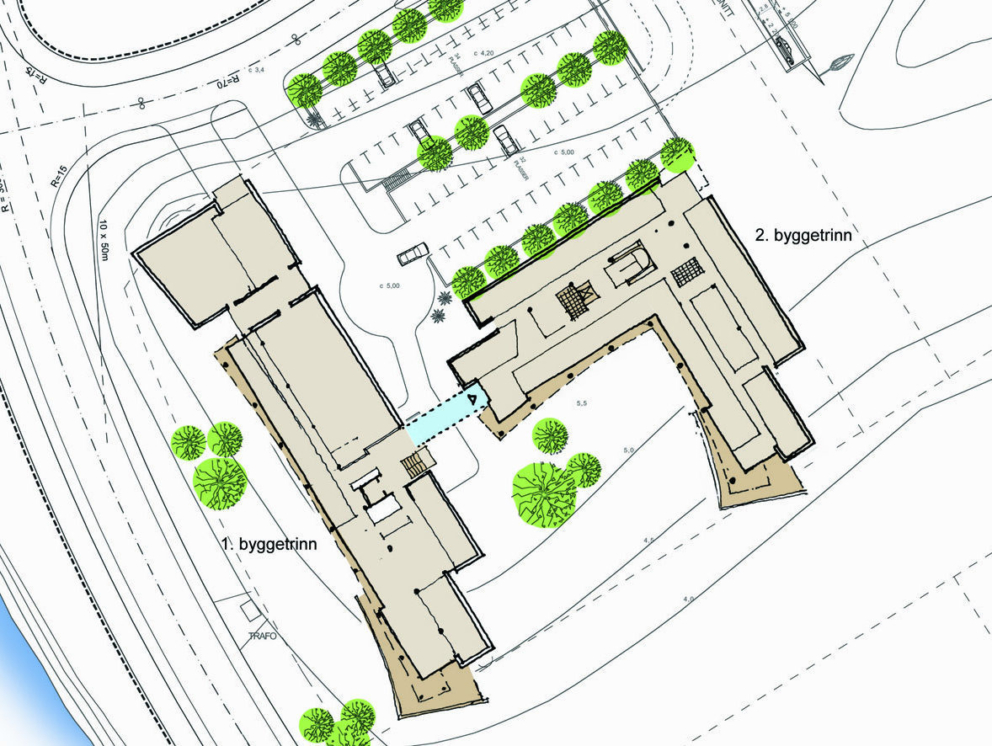 2 av 3 fløyer er bygget, med tre som hovedmateriale i fasadene, sammen med natureloksert aluminium. Glassgården mellom byggetrinn 1 og 2 fungerer som fellesareal og del av kantine.