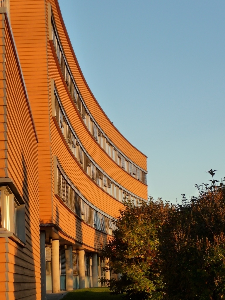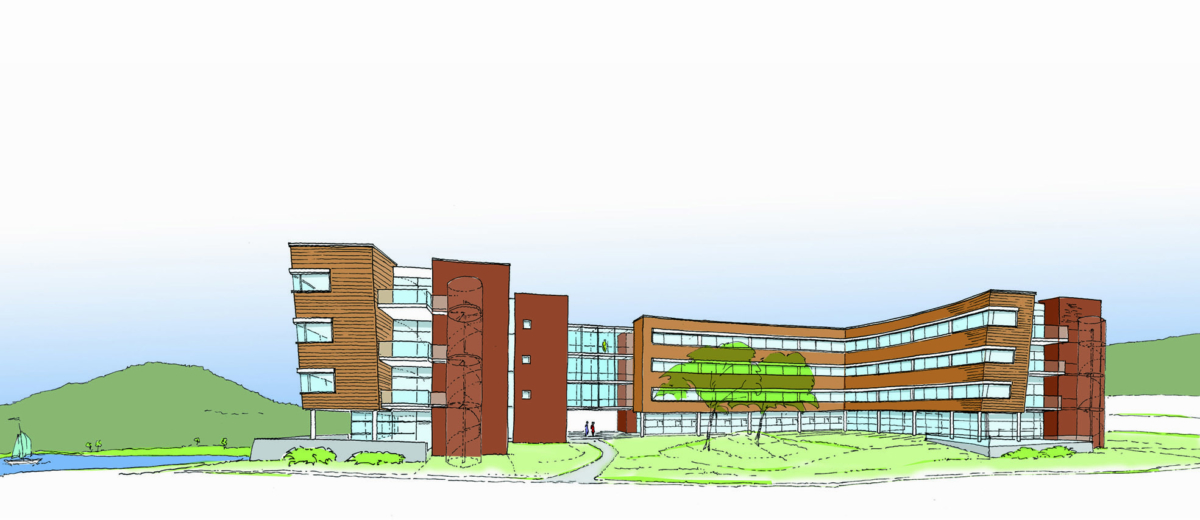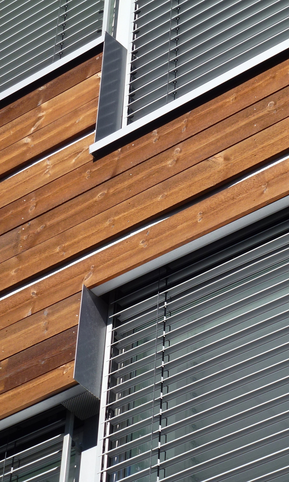 2 av 3 fløyer er bygget, med tre som hovedmateriale i fasadene, sammen med natureloksert aluminium. Glassgården mellom byggetrinn 1 og 2 fungerer som fellesareal og del av kantine.