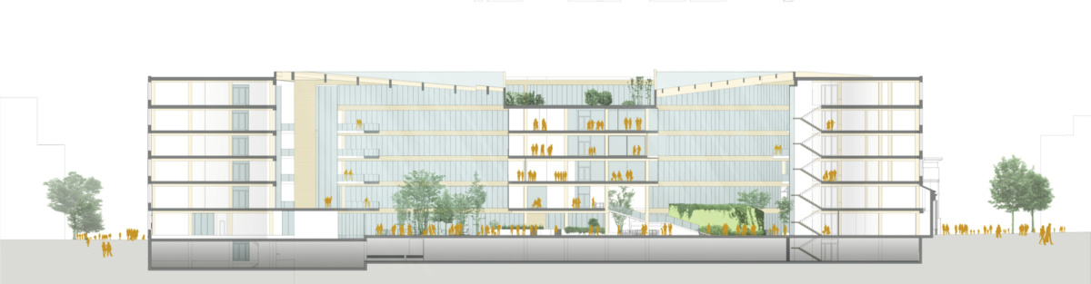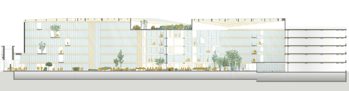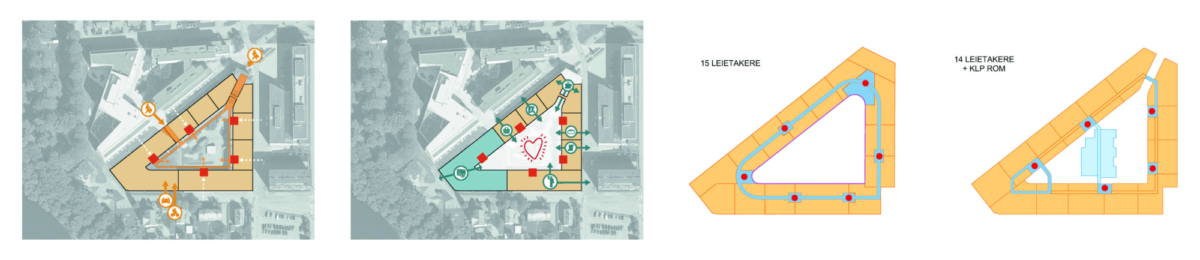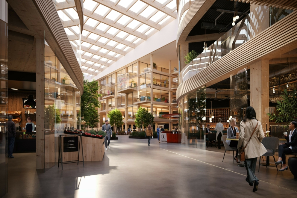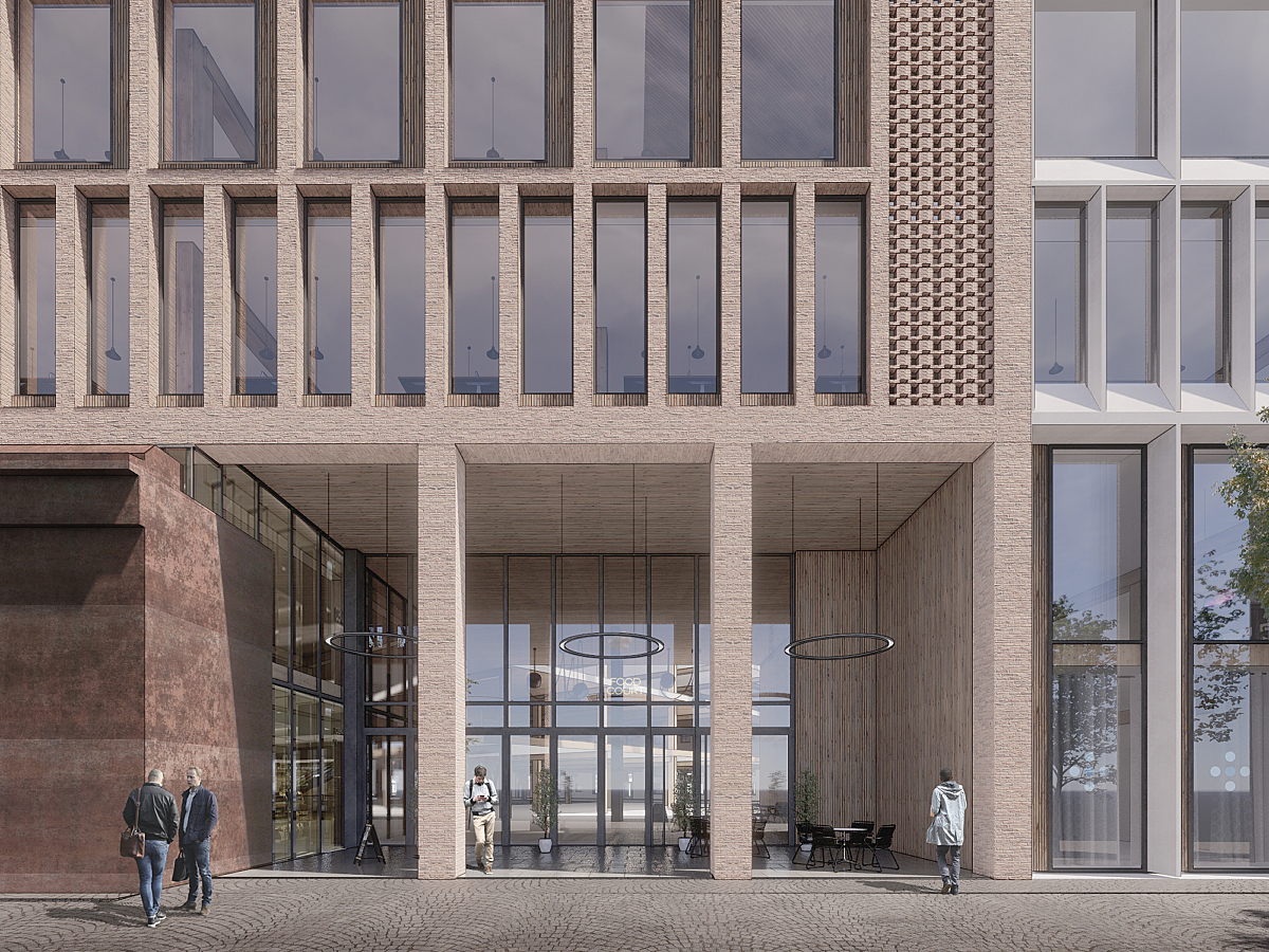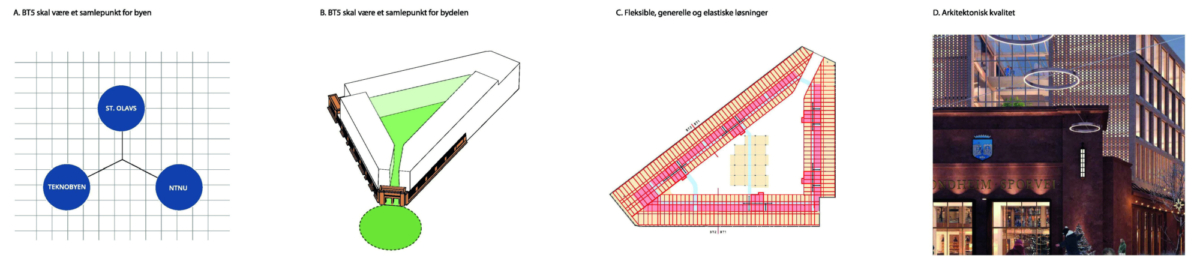 Vi ønsker at BT5 skal bli et møtested for både leietakere, brukere, bydelen og byen. Vår løsning er et utvendig torg og et innvendig atrium som åpner opp mot flere retninger, omfavner og inkluderer.