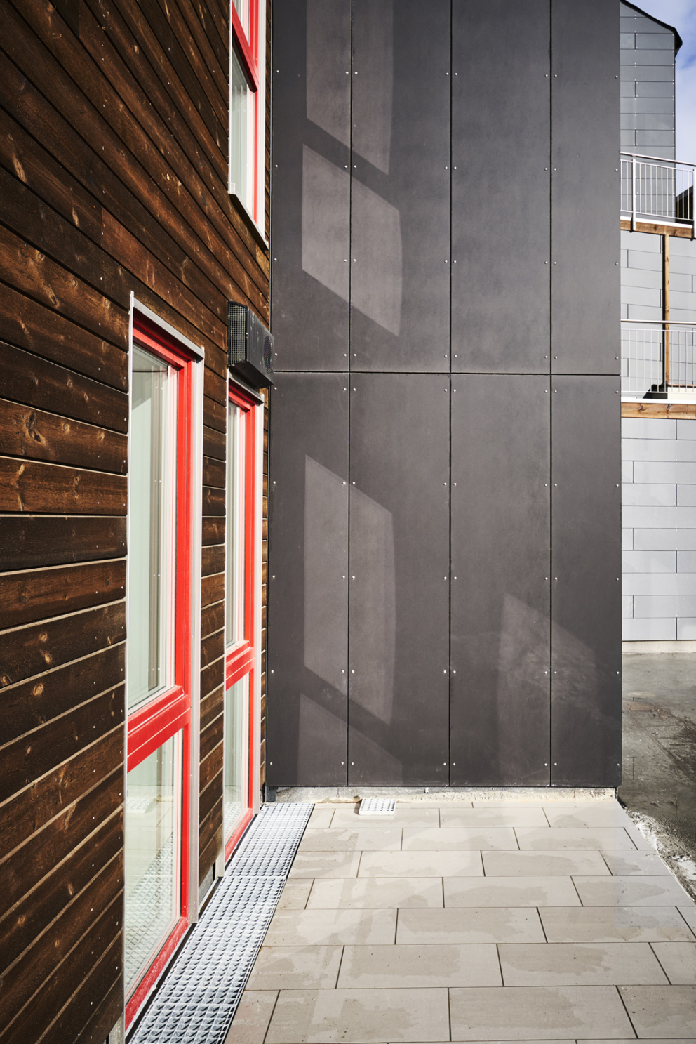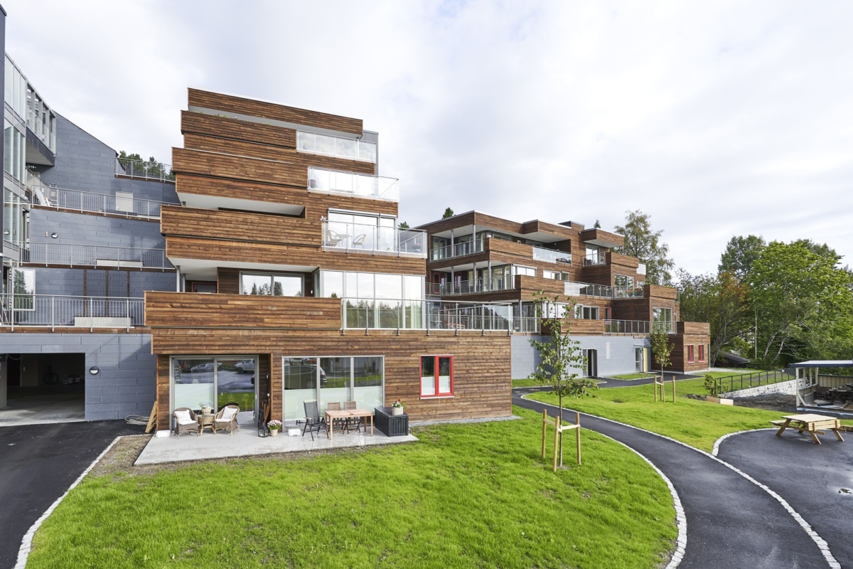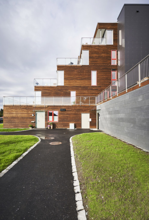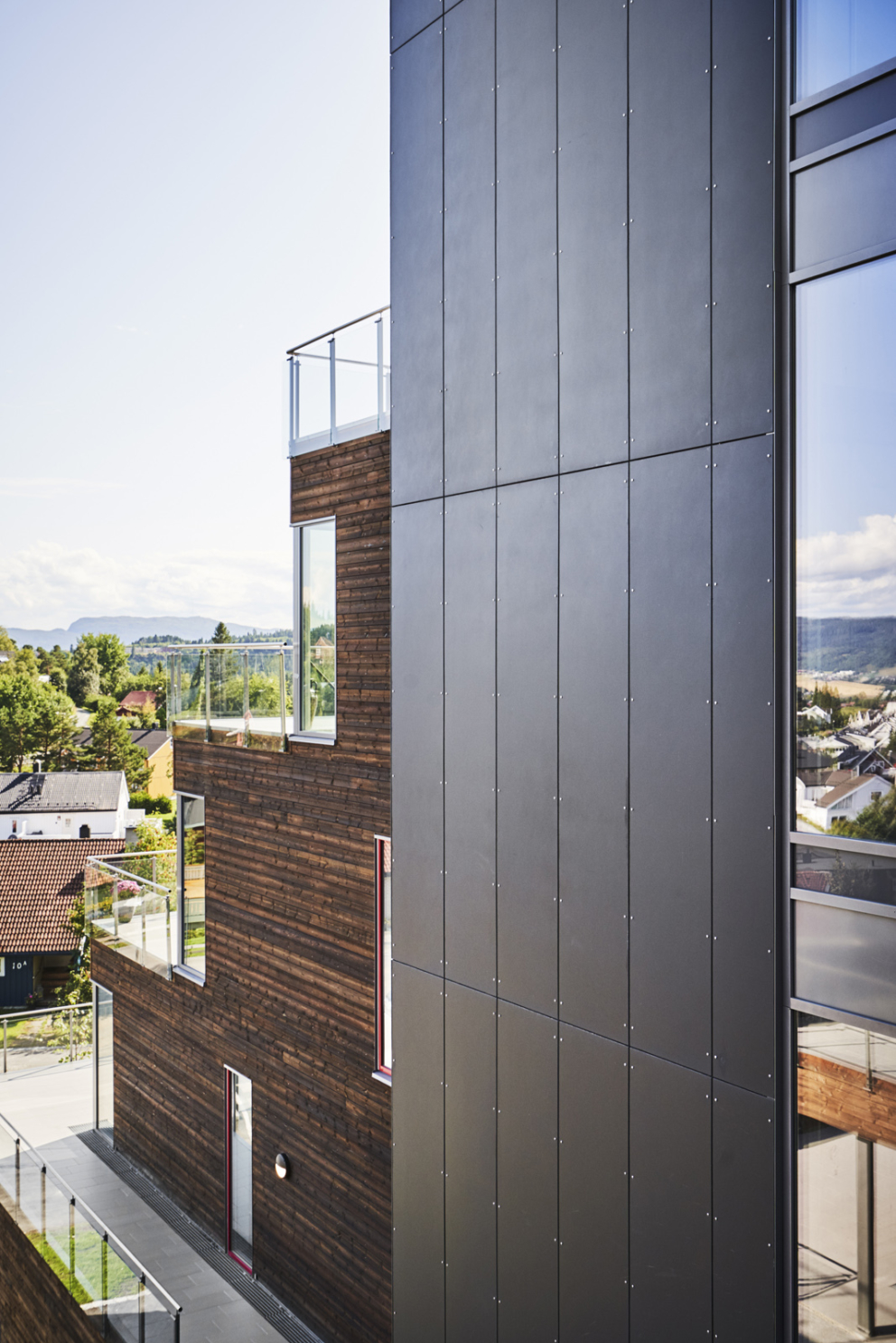 Bebyggelsen er delt i 3 parallelle volumer med grønne terrasser med adkomst mellom. Hovedmaterialet er mørkbeiset treverk.