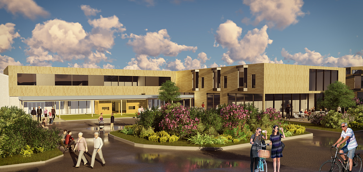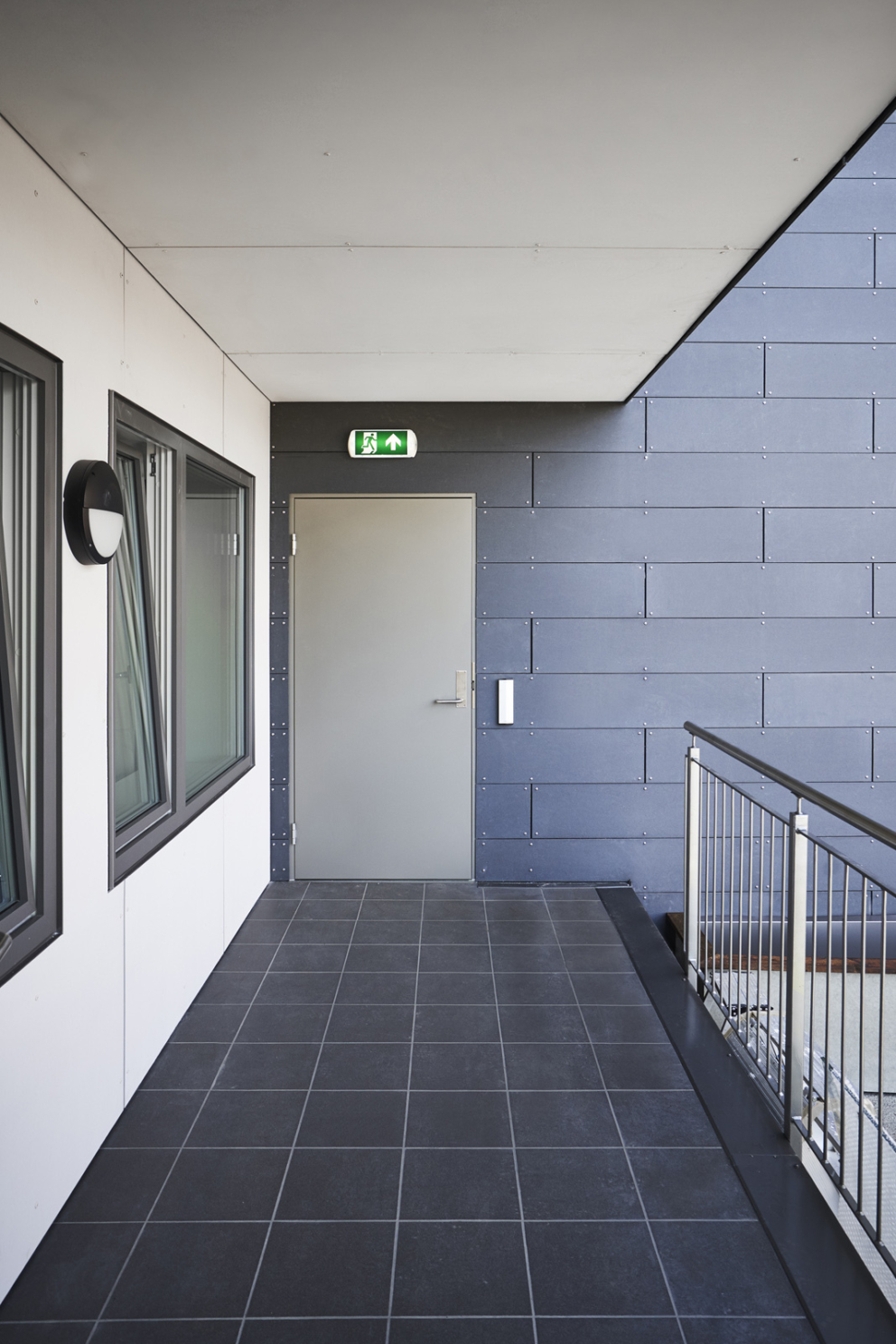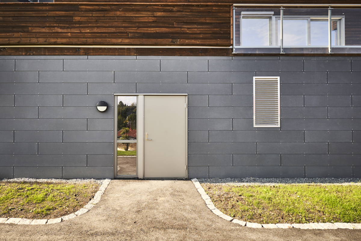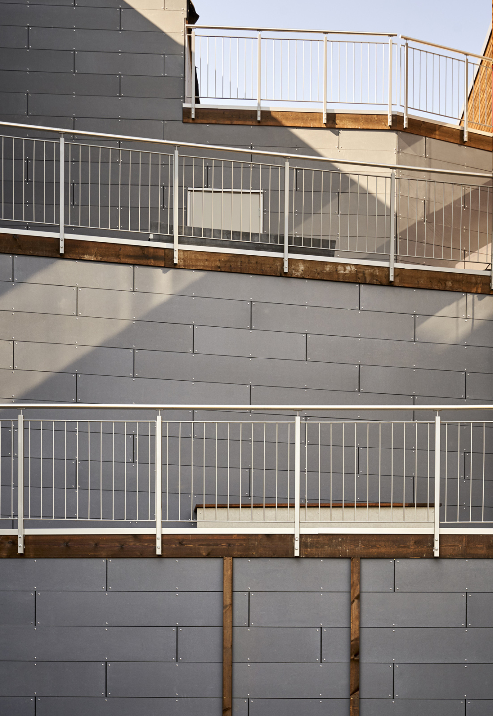 Bebyggelsen er delt i 3 parallelle volumer med grønne terrasser med adkomst mellom. Hovedmaterialet er mørkbeiset treverk.